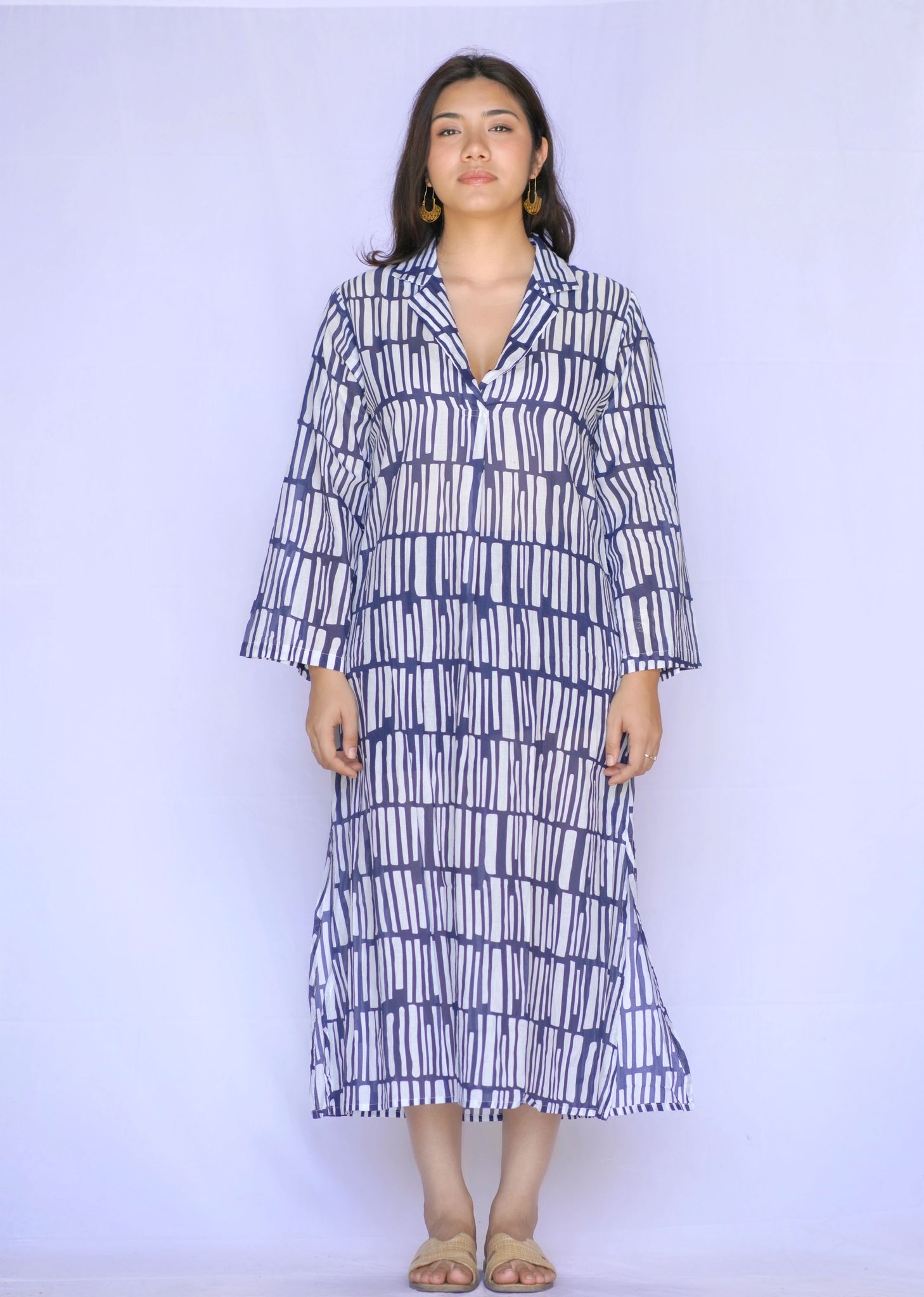 The Aashi Dress is a mid length, collared, tunic style dress with 3/4 sleeves in a watercolor geometric print. Grey and light blue brush strokes are block printed by hand on 100% cotton fabric to create a flattering look for this casual daytime dress.