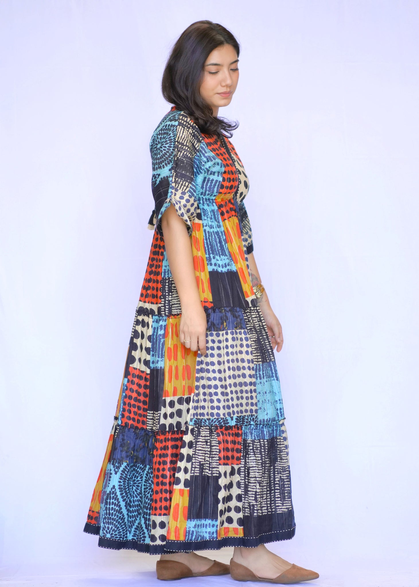 Turn heads in our glamourous Julieta dress. Made from 100% cotton this dress features a plunging v-neckline and a tieback detail. This tiered maxi length dress has dramatic bell sleeves and features a bold print in rich jewel tones. Pair this dress with sandals and a sun hat for a beautiful daytime look.