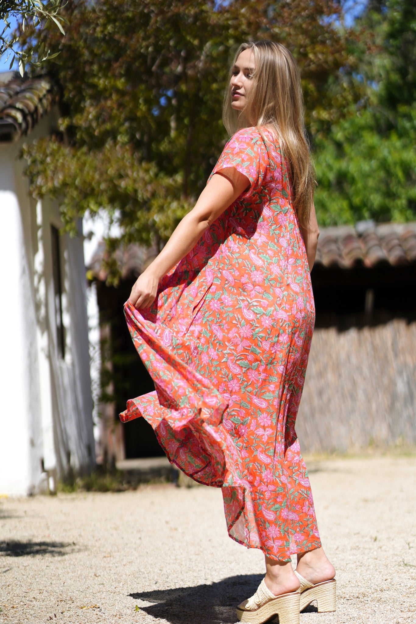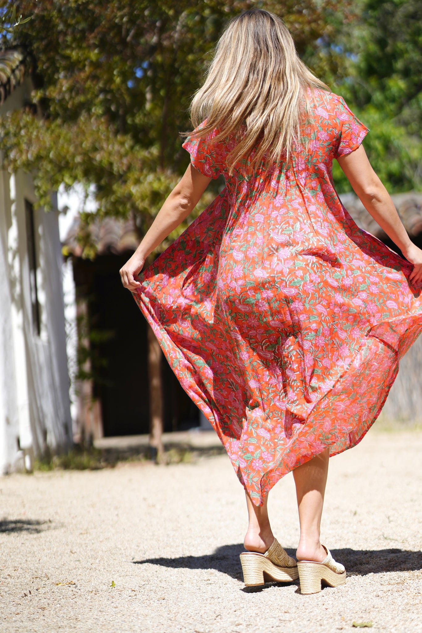 Stay comfortable and stylish in this V-neck dress crafted from breathable cotton material. The floral pattern and short sleeves make it the perfect choice for warmer weather. Enjoy all-day comfort in this must-have dress.