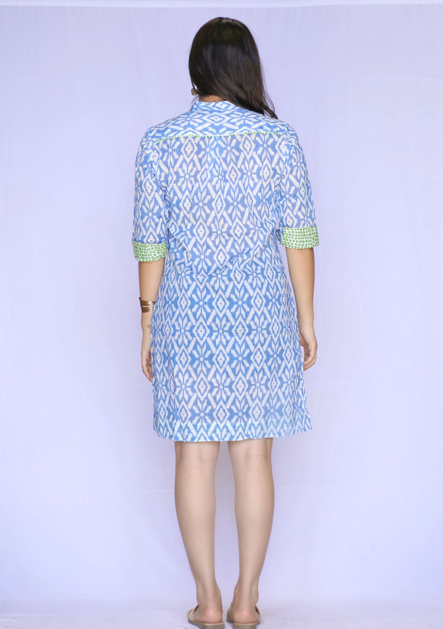 Perfect for a spring or summer day , the Amelia dress is a lightweight cotton tunic style with a contrasting cuff sleeve and hemline. The neckline features a flattering deep v with contrasting detail trim.
