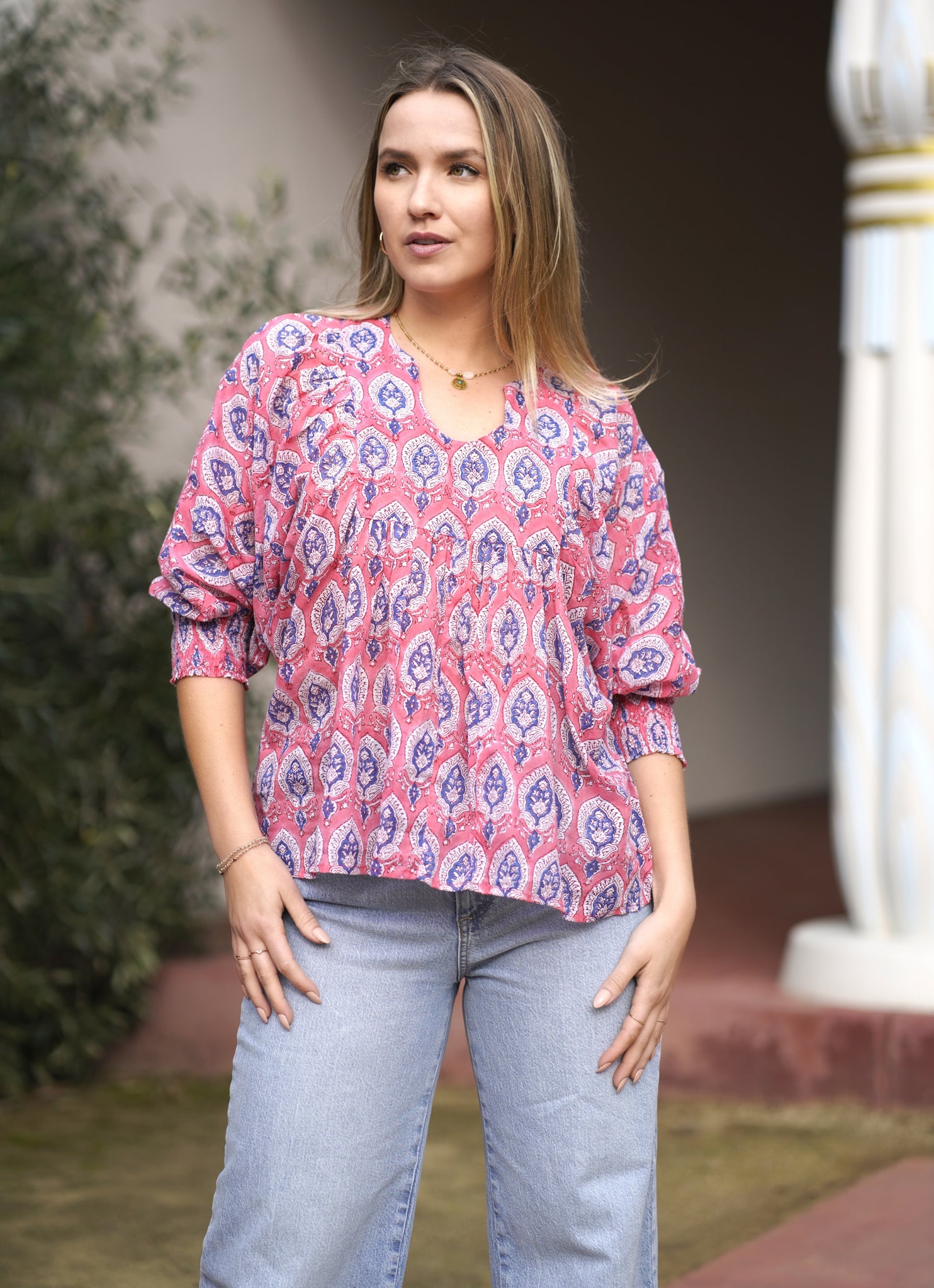 The Anjou Top is a lightweight floral block printed blouse, perfect to wear on your vacation after a sunny day at the beach. Wear it tucked in or out of our favorite denims with sandals or heels.