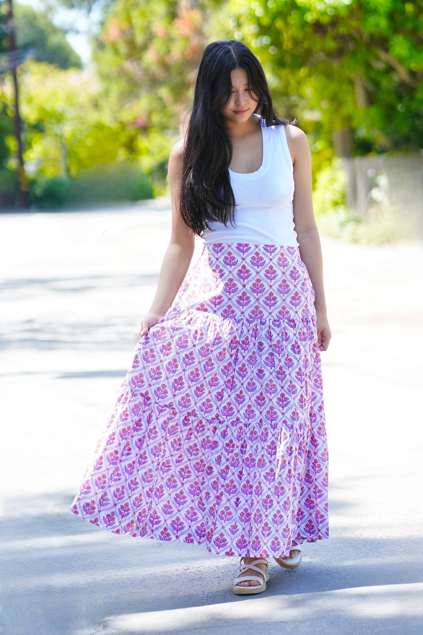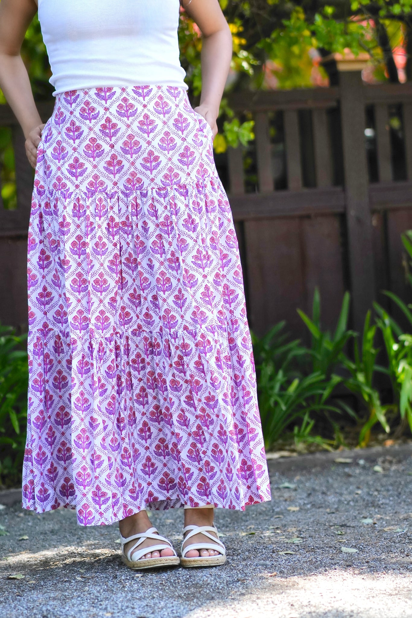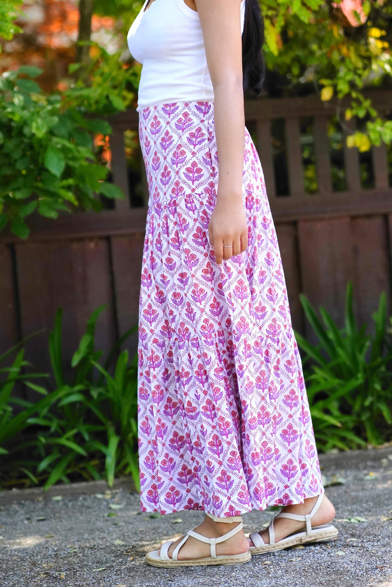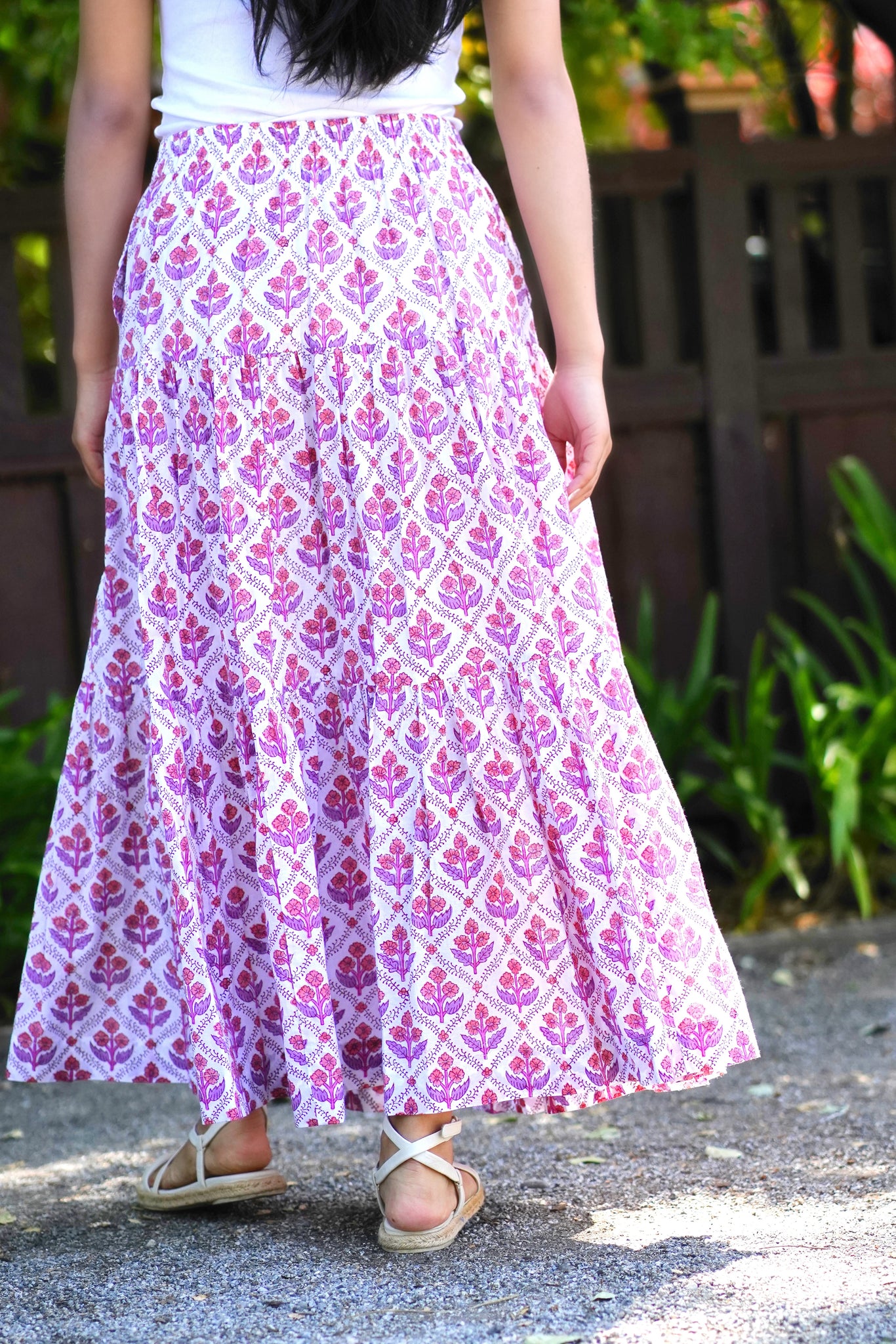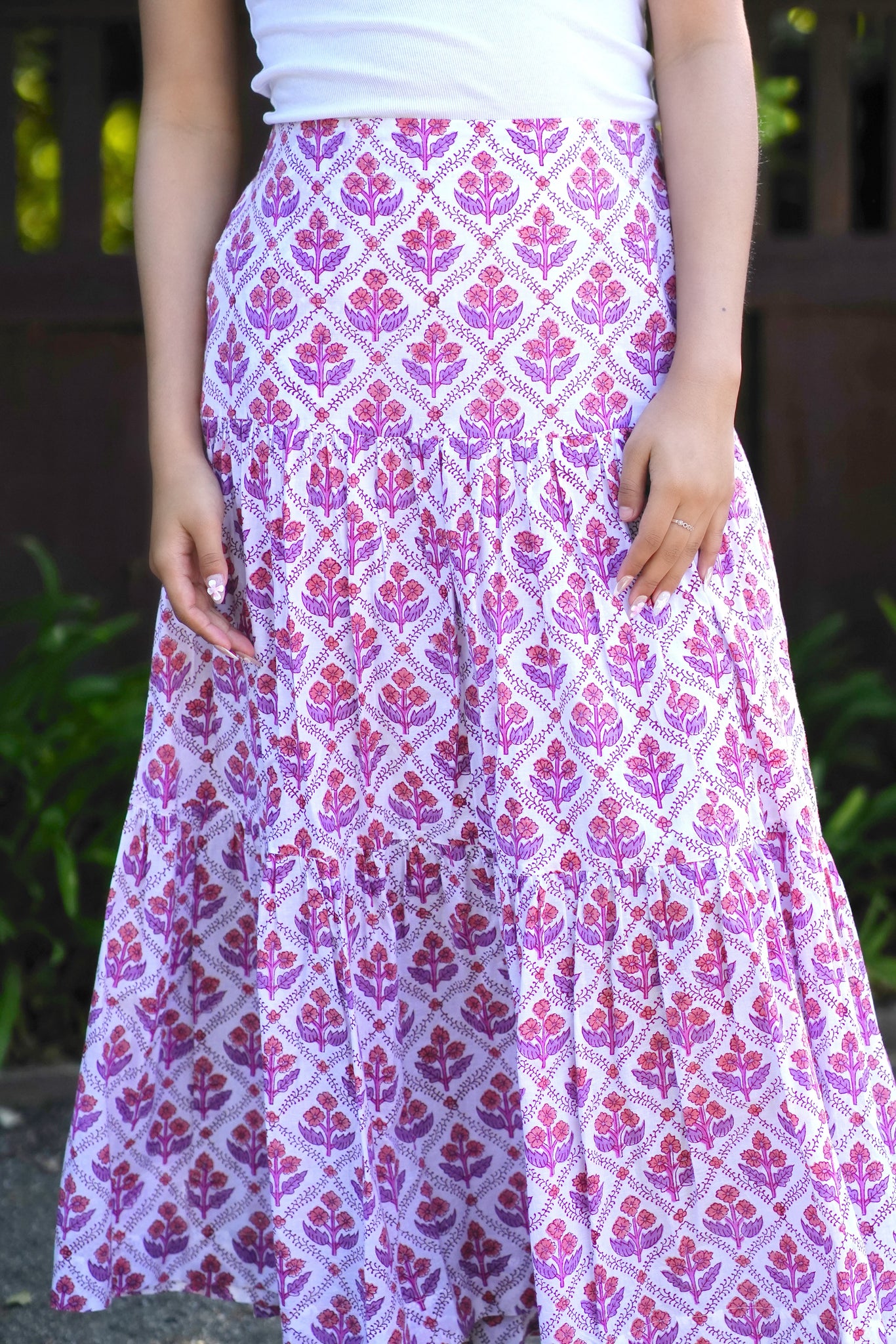 Block Printed Tiered Cotton Skirt- Purple White