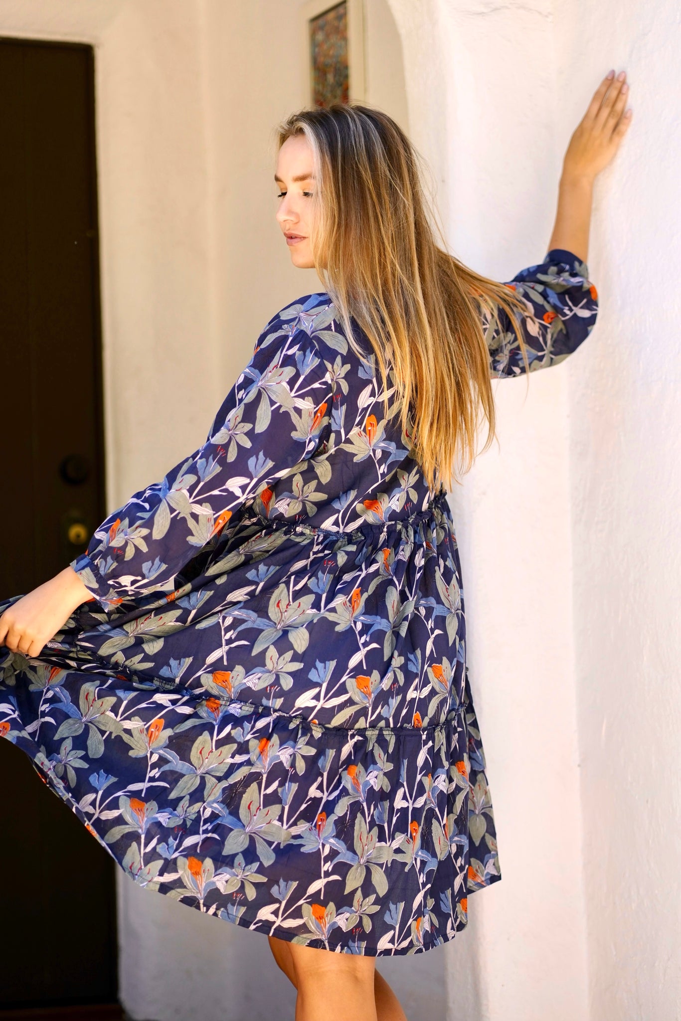 The Camby Dress is a vacation ready with an easy flowy silhouette and a beautiful floral print. Perfect to throw over and go, the Camby Dress features a three- quarter length sleeves and a flattering split neck with tassel ties.
