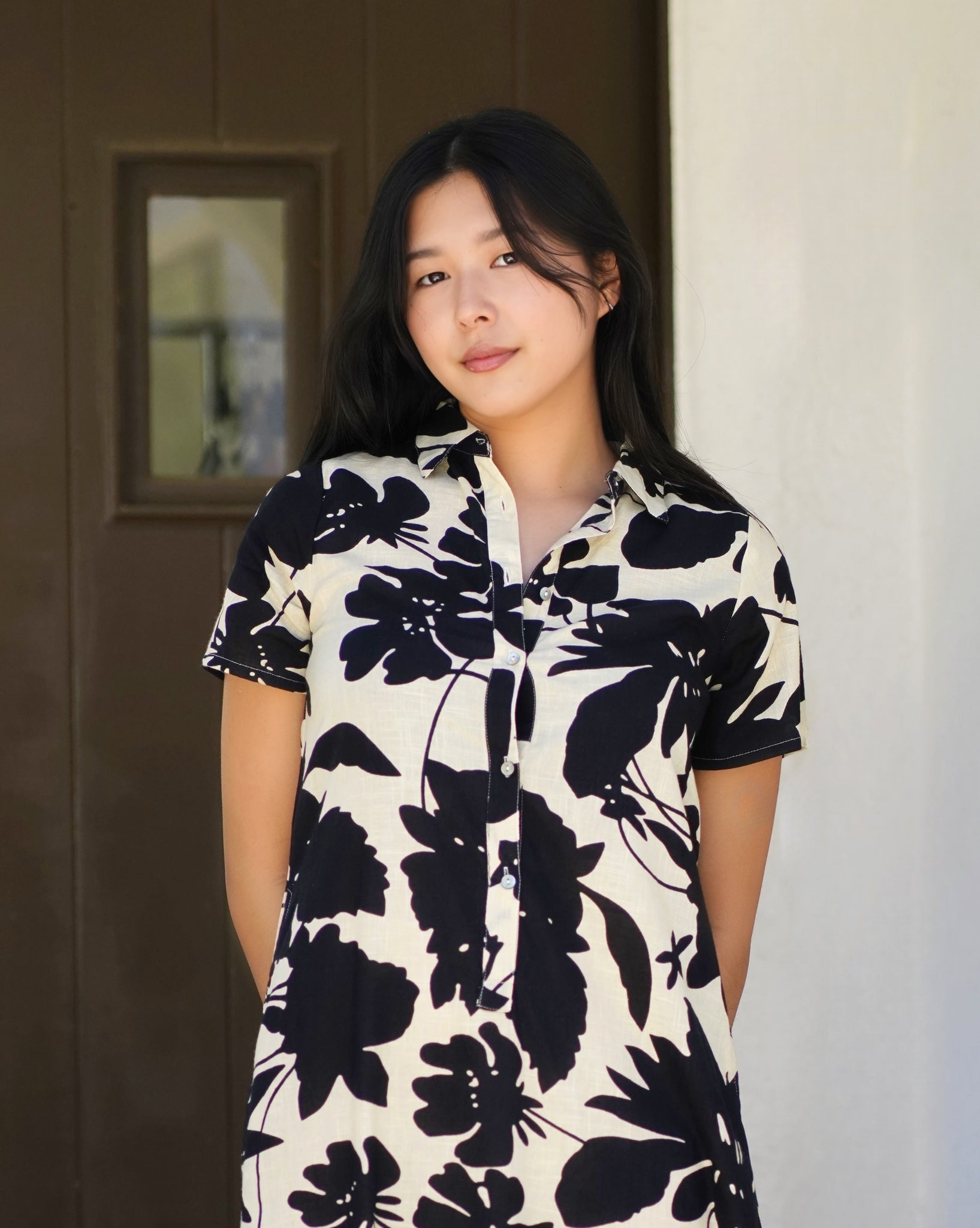 The Carrie Dress is a breathable and lightweight pullover dress in an abstract leaf print.