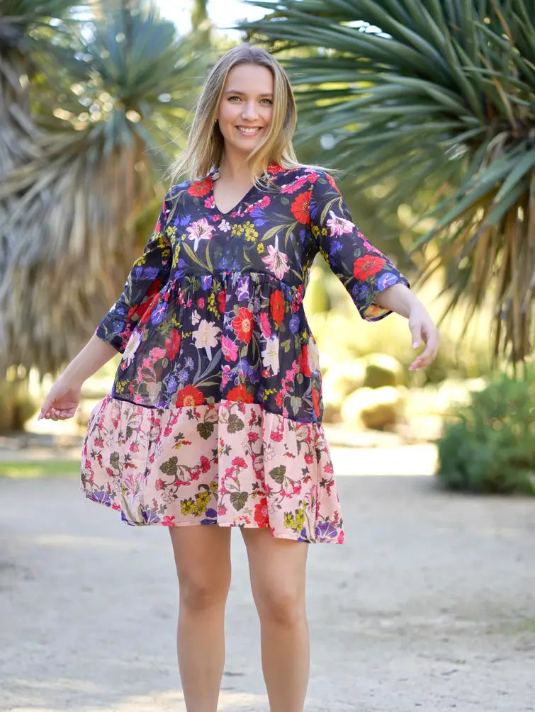 The Cassie Dress is a tiered dress with 3/4 quarter length sleeves ; a dress designed to be worn from the farmers market to the pool, from the beach to dinner dates.