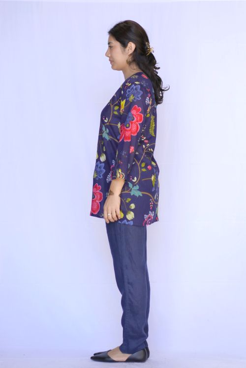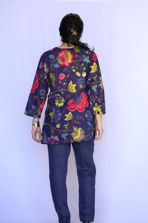 This navy floral cotton tunic is a stylish and comfortable addition to your wardrobe. Made from 100% cotton, it provides a soft and breathable feel, perfect for any occasion. Its floral print adds a touch of femininity, while the tunic design offers a flattering fit. A must-have for any fashion-forward individual.