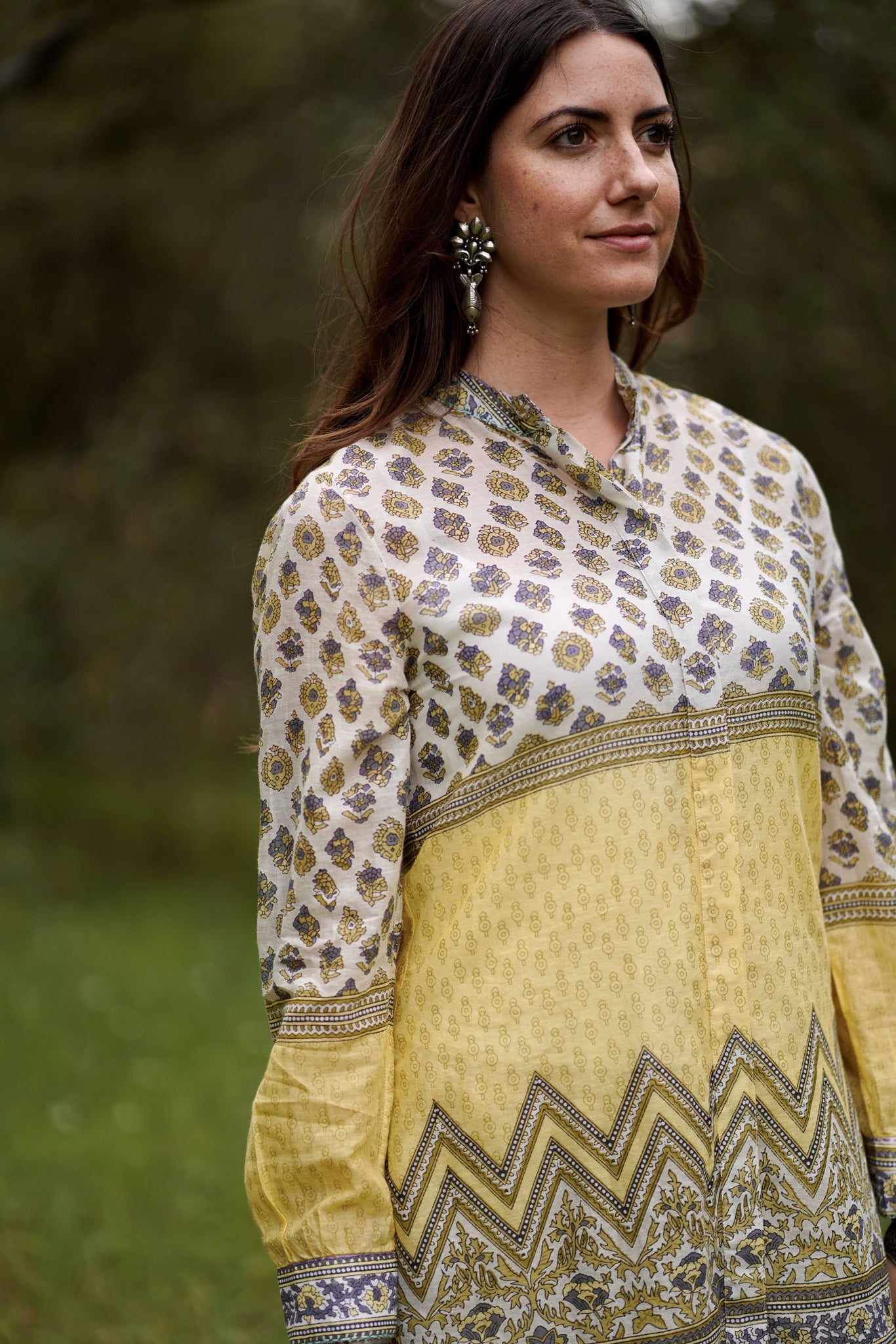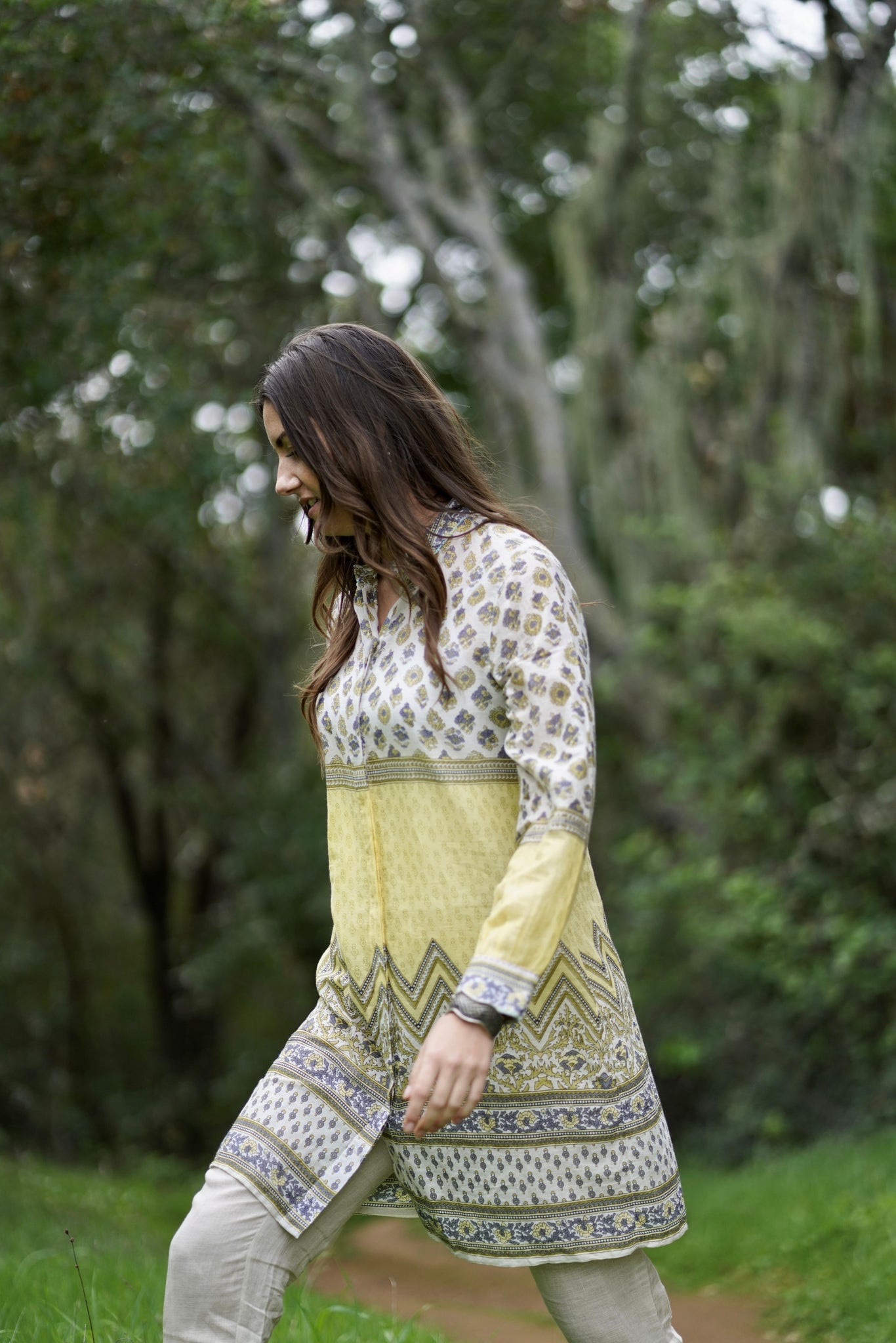 Beautifully crafted lightweight block printed button down tunic is a simple and straight cut style that you will always grab for through the summer heat. Easy to wear and comfortable in an airy cotton fabric, the style is designed with a mandarin neck and button down tunic shirt silhouette.
