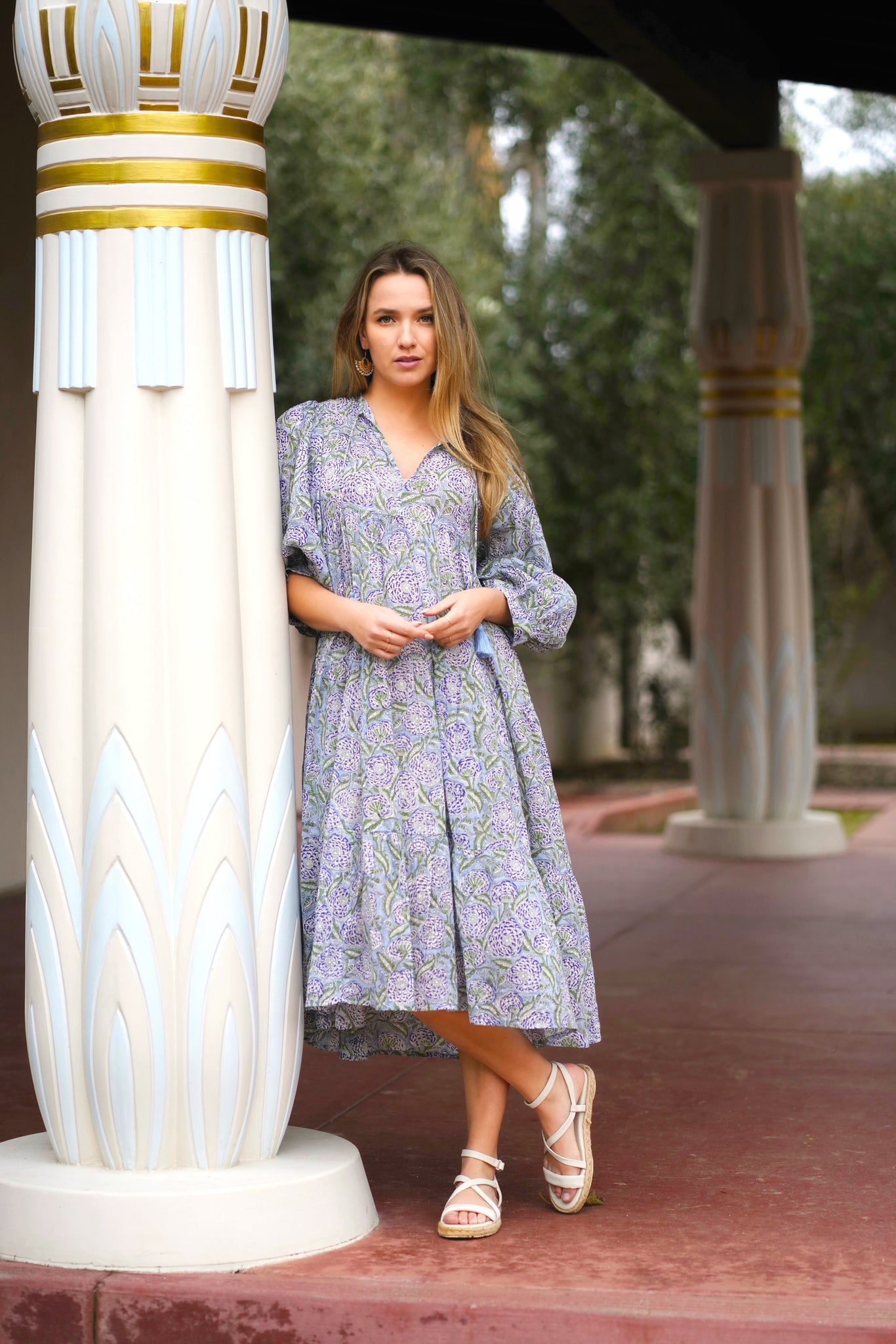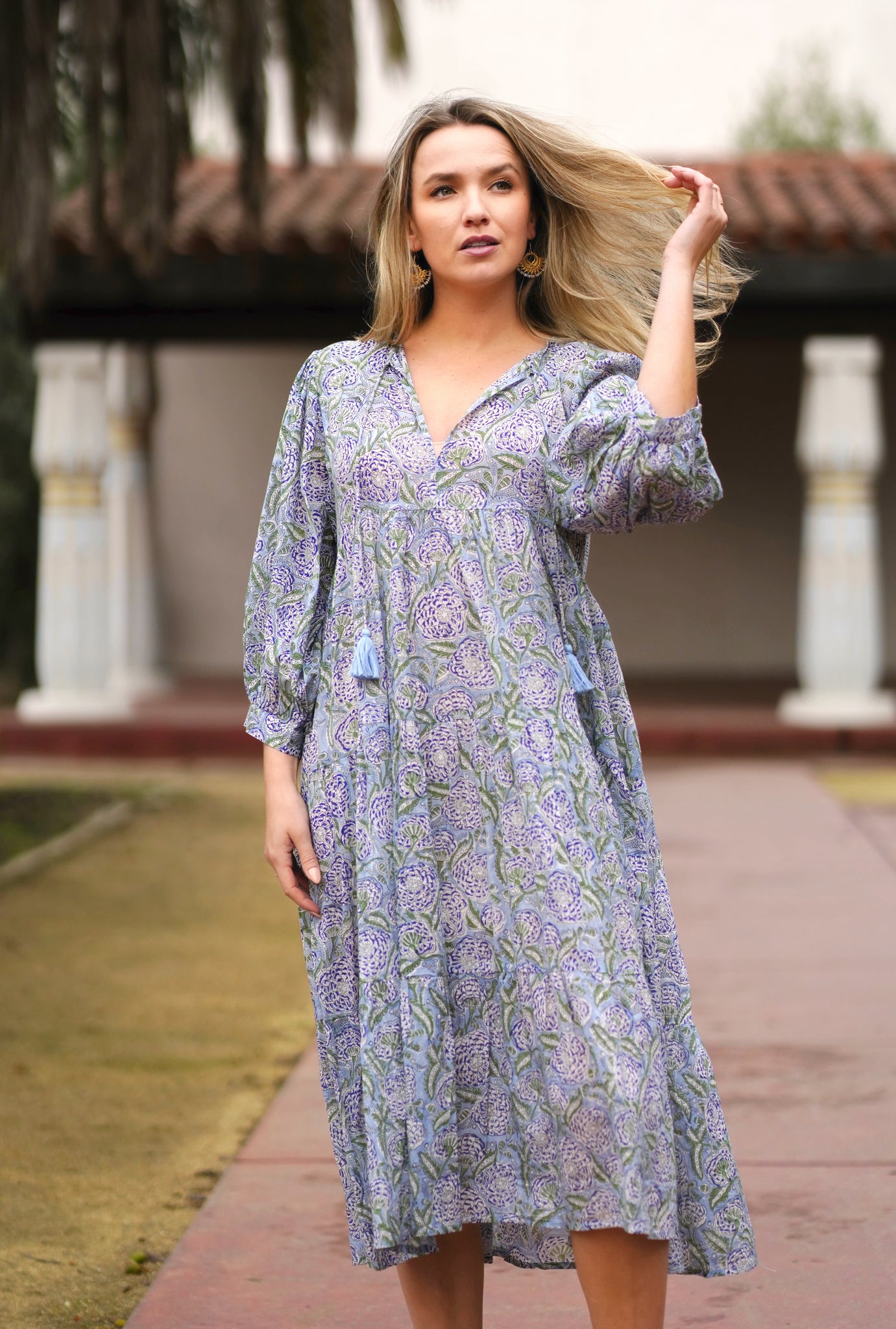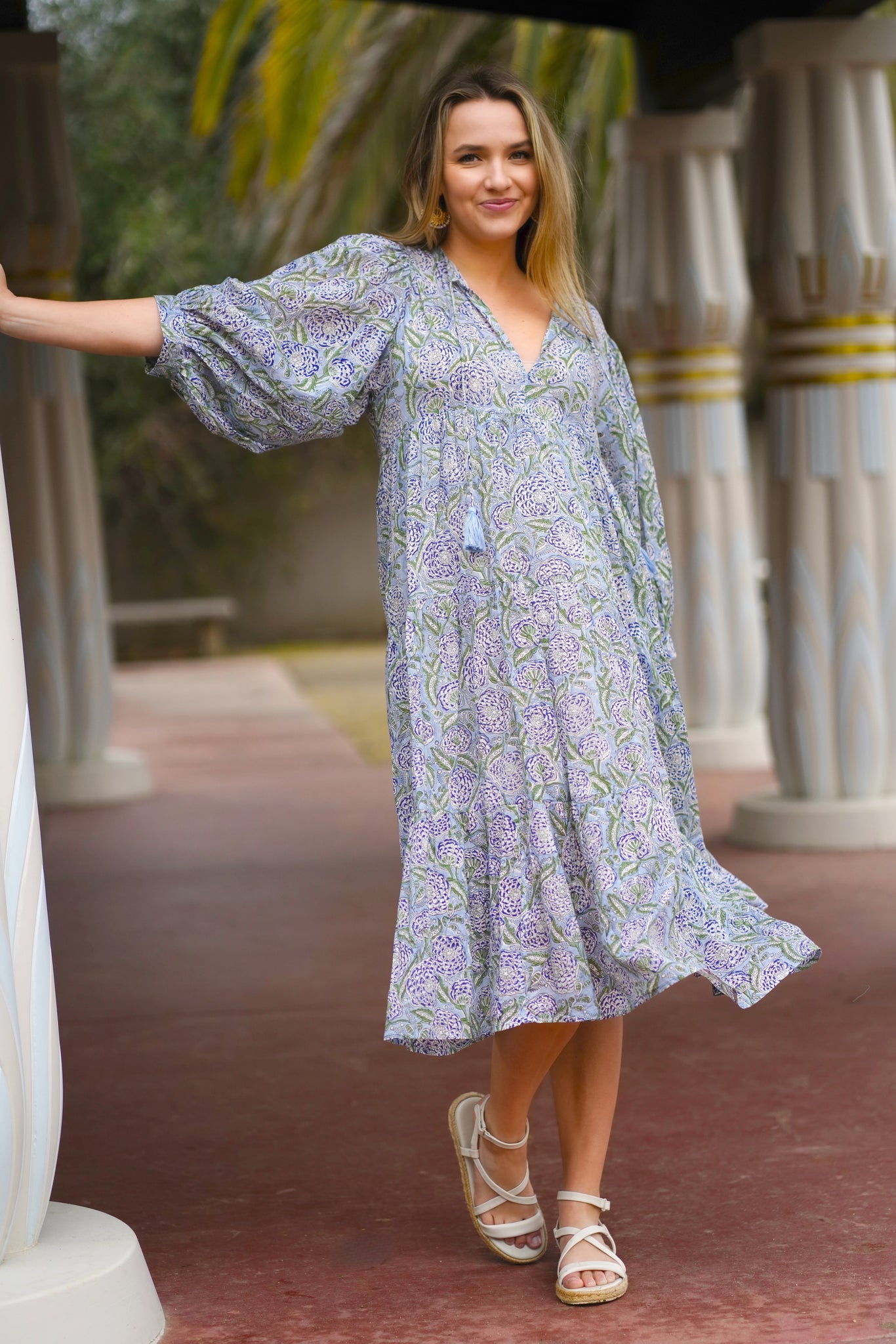 A flowy, soft cotton dress- hand made using the traditional method of hand block printing.