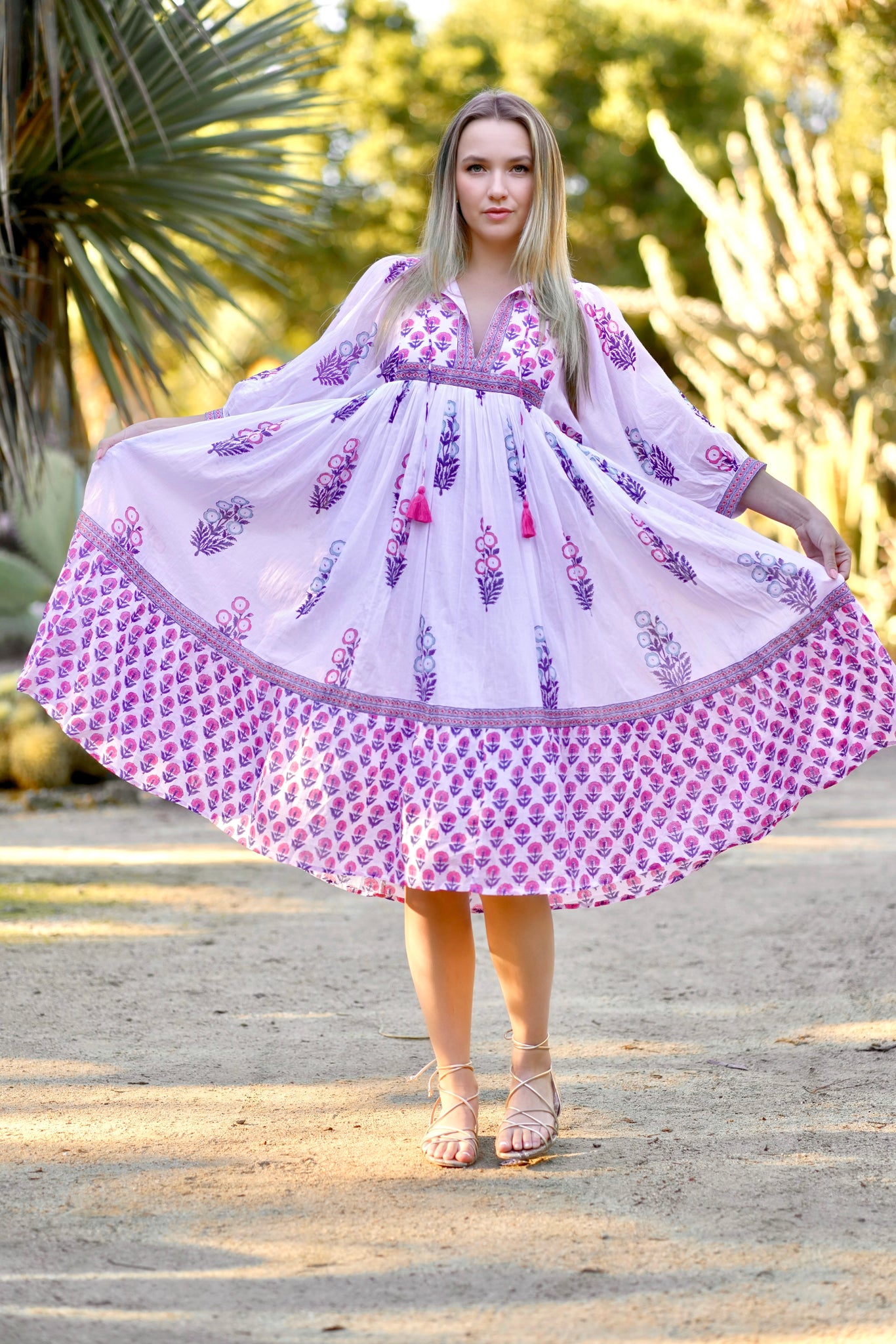 A flowy, soft cotton dress- hand made using the traditional method of hand block printing.