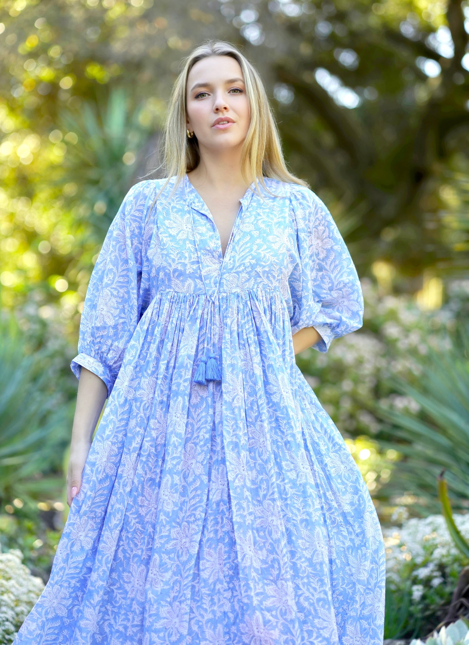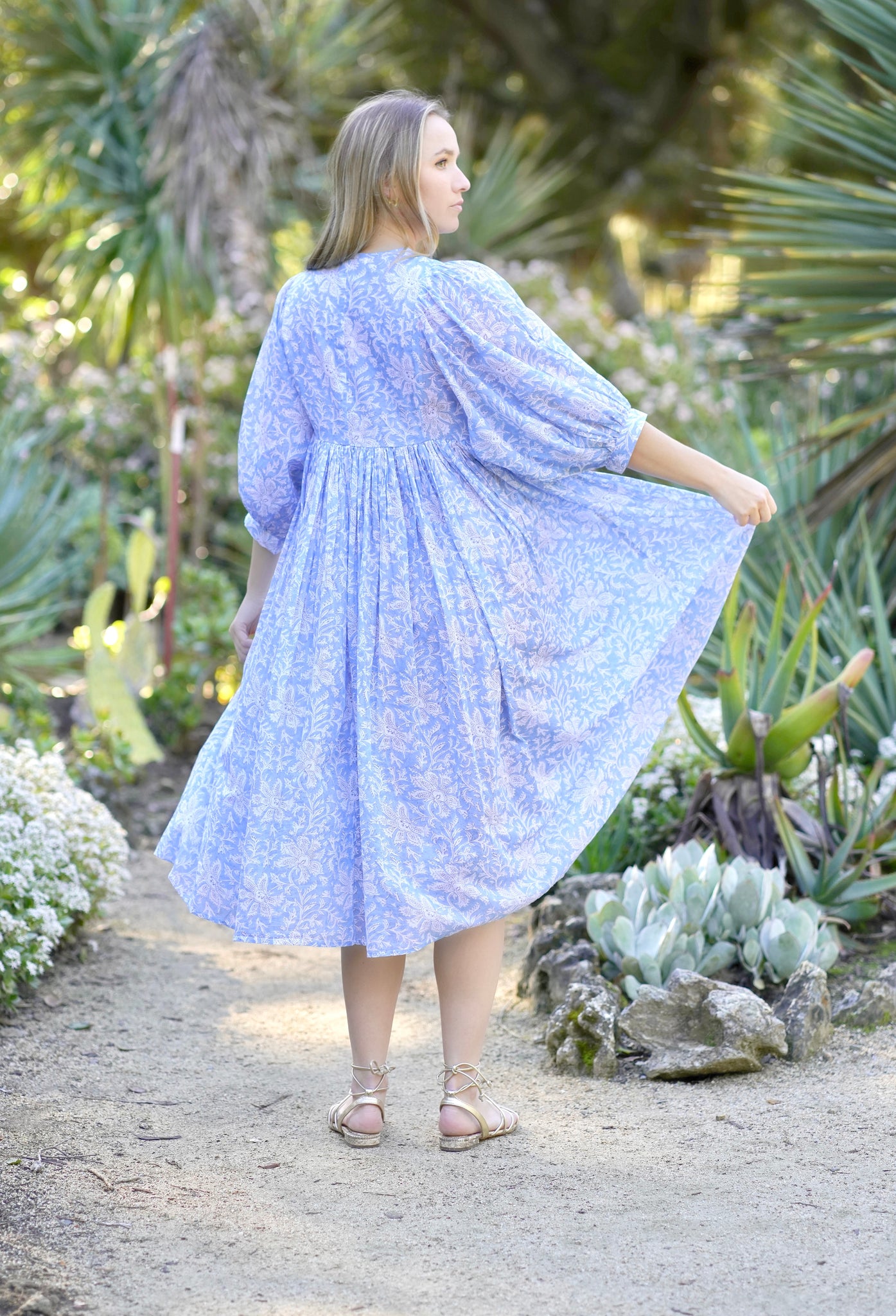 A flowy, soft cotton dress- hand made using the traditional method of hand block printing.