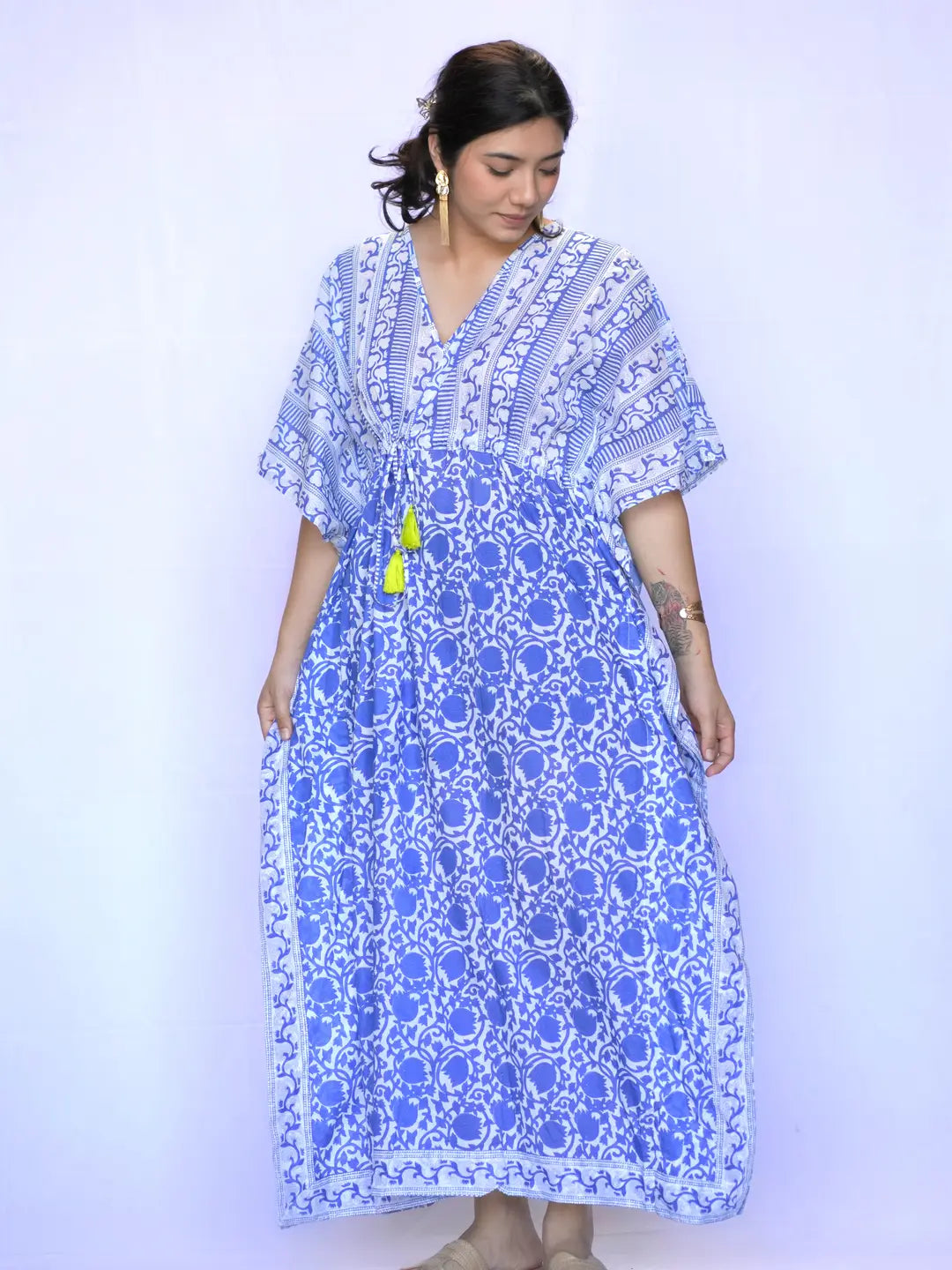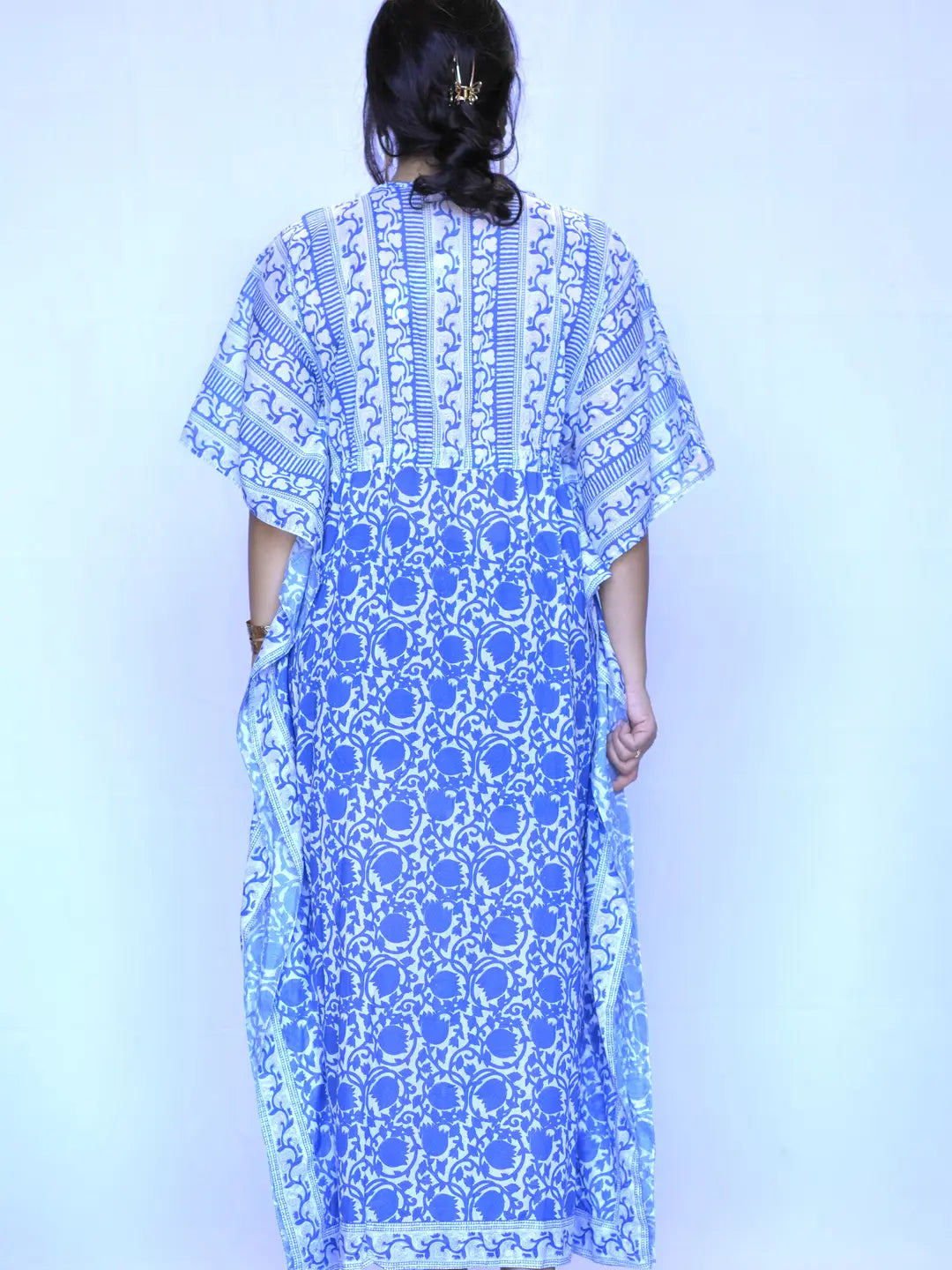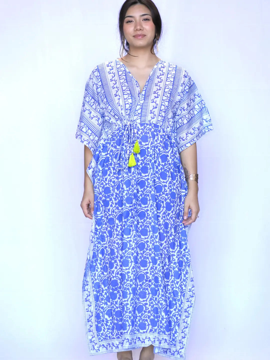 The Nayla Kaftan is the perfect poolside ensemble. It features a flattering v-neckline and a drawstring waist. Pair this full-length Kaftan with a pair of sandals and gold jewelry.
