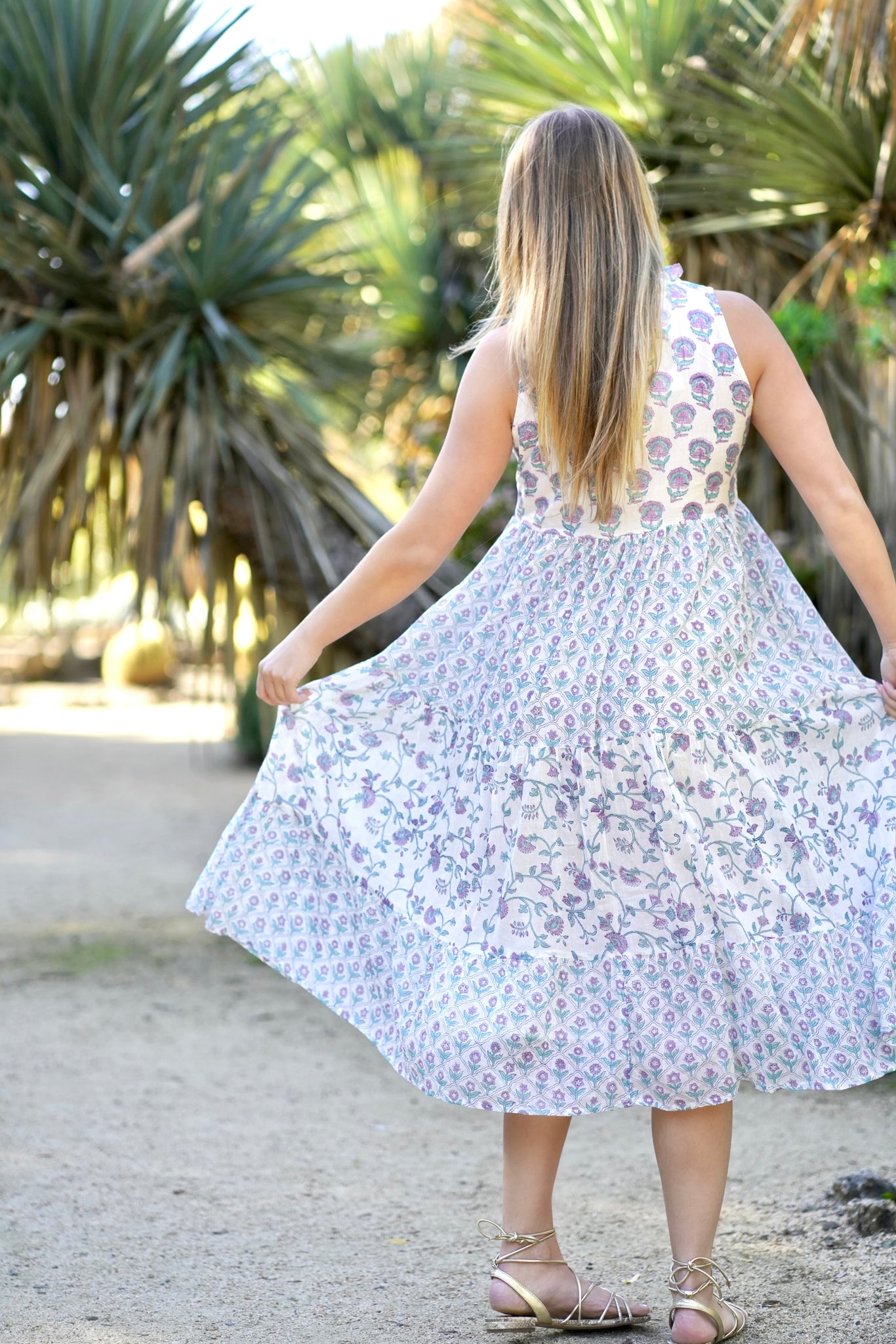 The captivating Nola Dress is crafted from light weight cotton voile fabric- its hand block printed with multi pattern floral print. This stunning piece is sleeveless and features a ruffle collar with tassel front tie. This elegant and alluring maxi dress is perfect for a sunny day out or for drinks in the evening.