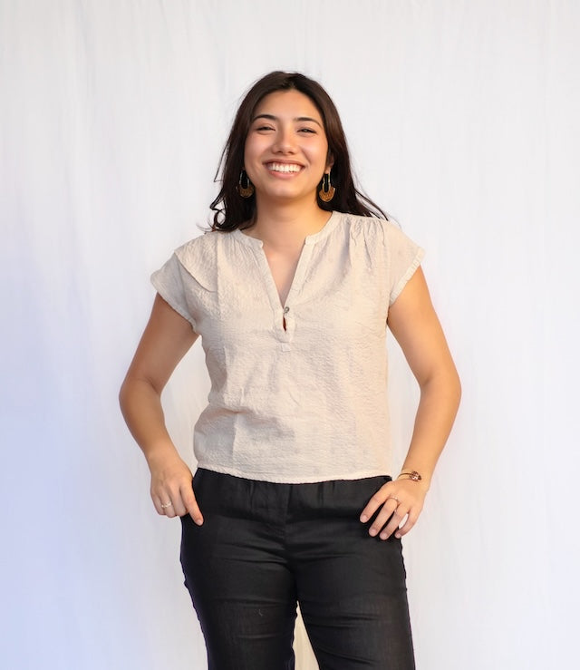 Pleated Shoulder V-neck blouse goes with any Dolma pant or skirt beautifully. Made of fine cotton , the fabric has a textured dot pattern woven into it for subtle detail.