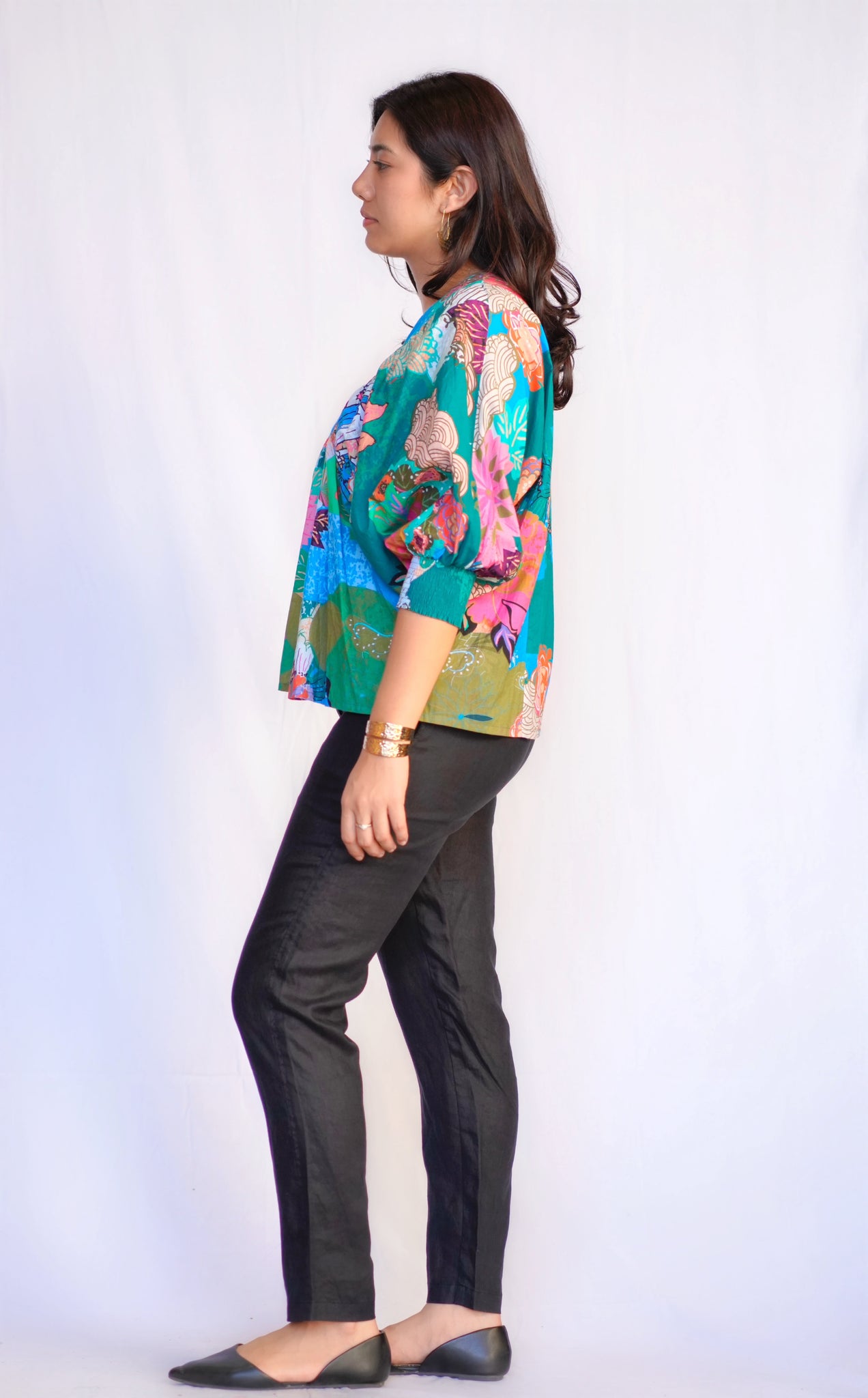 - 3/4 length sleeves w/ soft gather band at the cuff