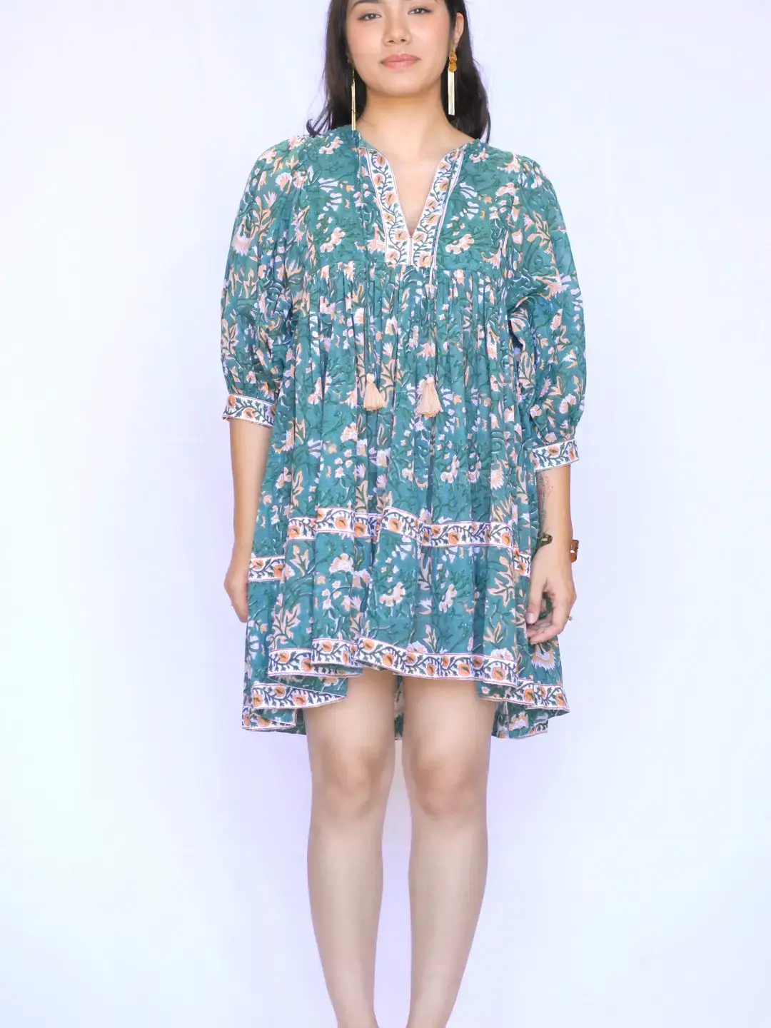Hand crafted from a soft cotton voile fabric, this dress is designed with a fun feminine silhouette, voluminous skirt, tassel tie detail, and billowy sleeves.