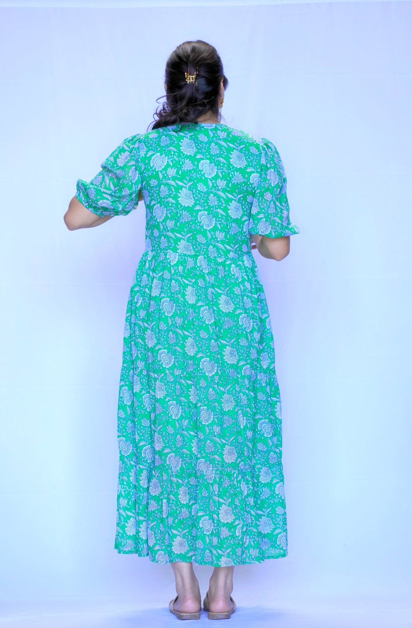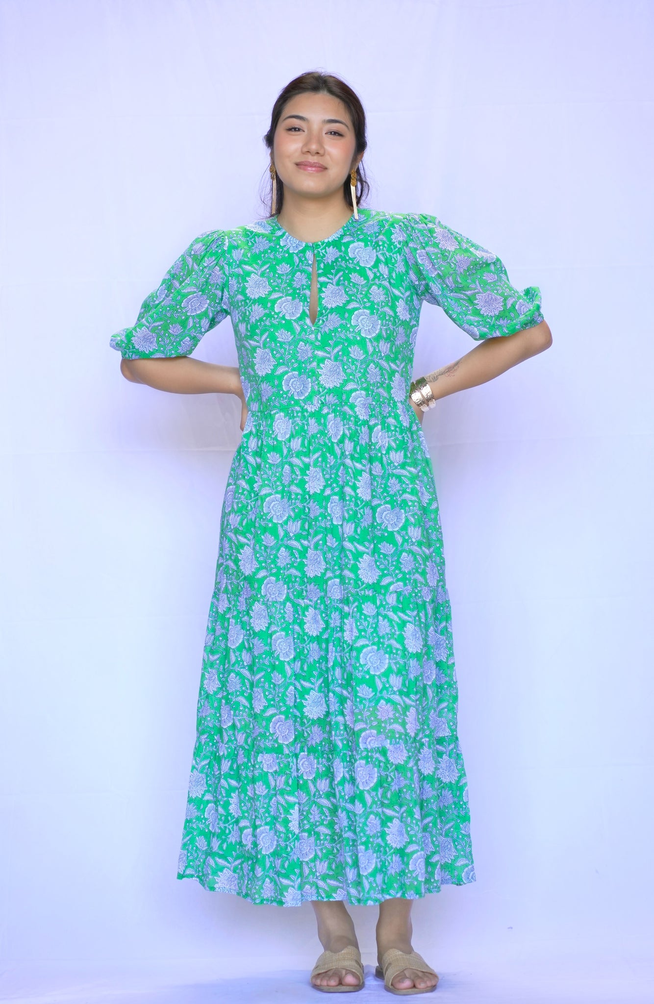 The Remi Maxi Dress has a flowy silhouette with a split neckline and the perfectly puffed sleeves.
