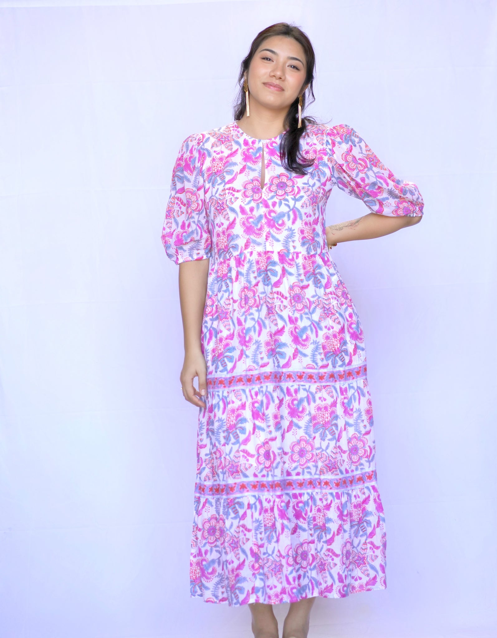 The Remi Maxi Dress has a flowy silhouette with a split neckline and the perfectly puffed sleeves.