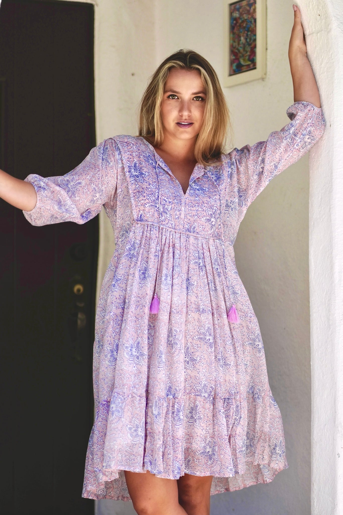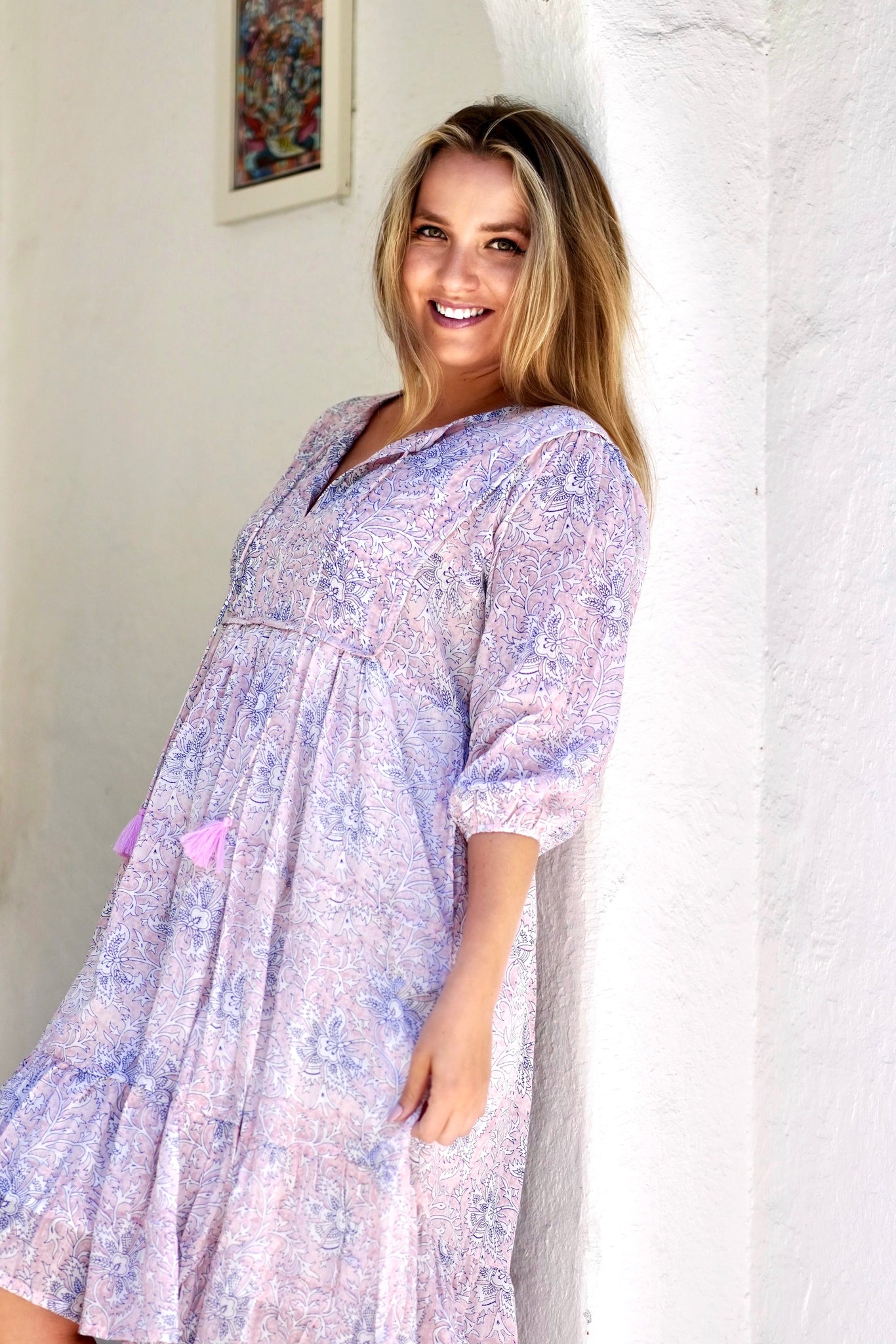 Effortless cotton dress that boasts a 3/4 sleeve and elastic cuffs. Its floral design and medium length make it a versatile piece that complements any style.