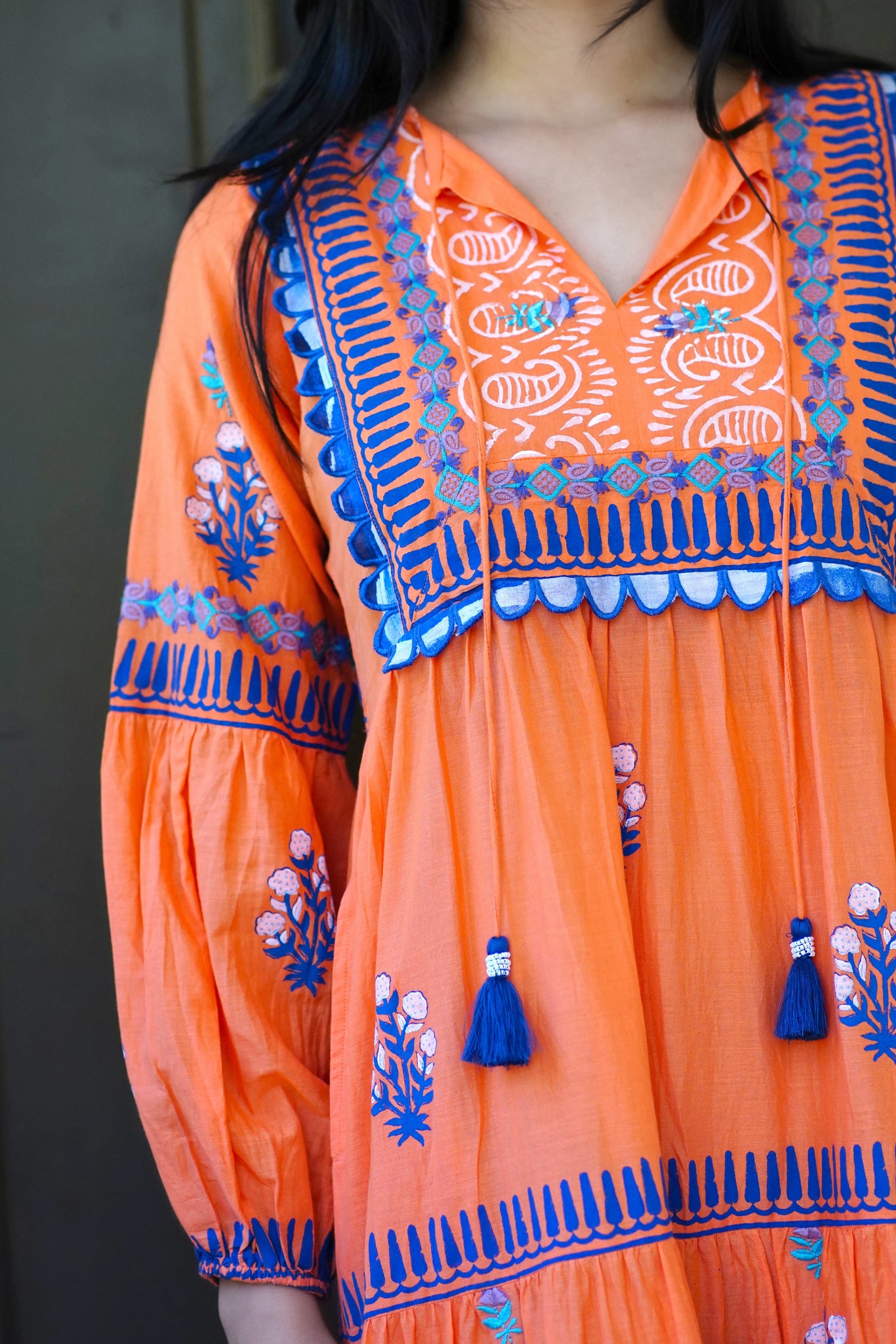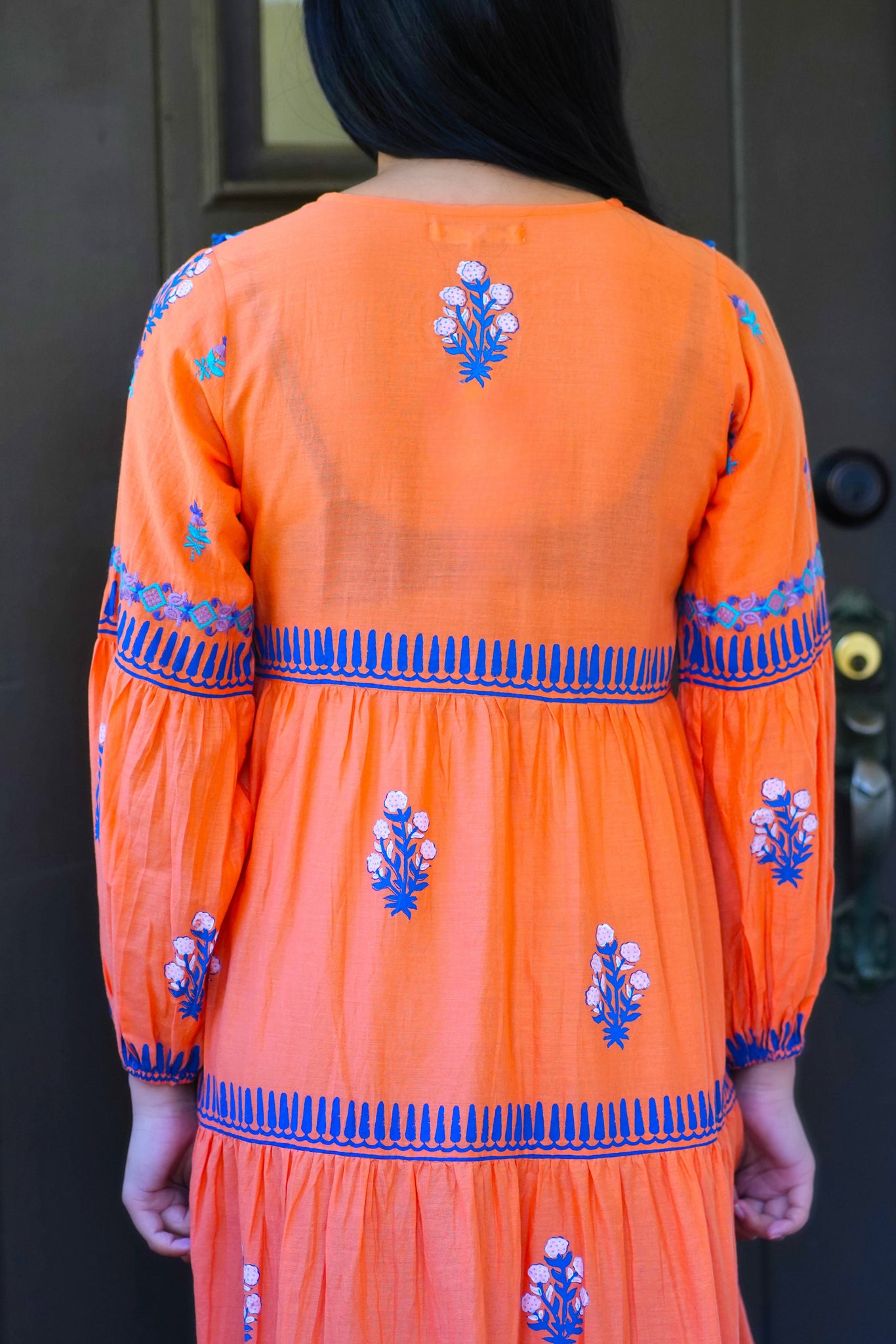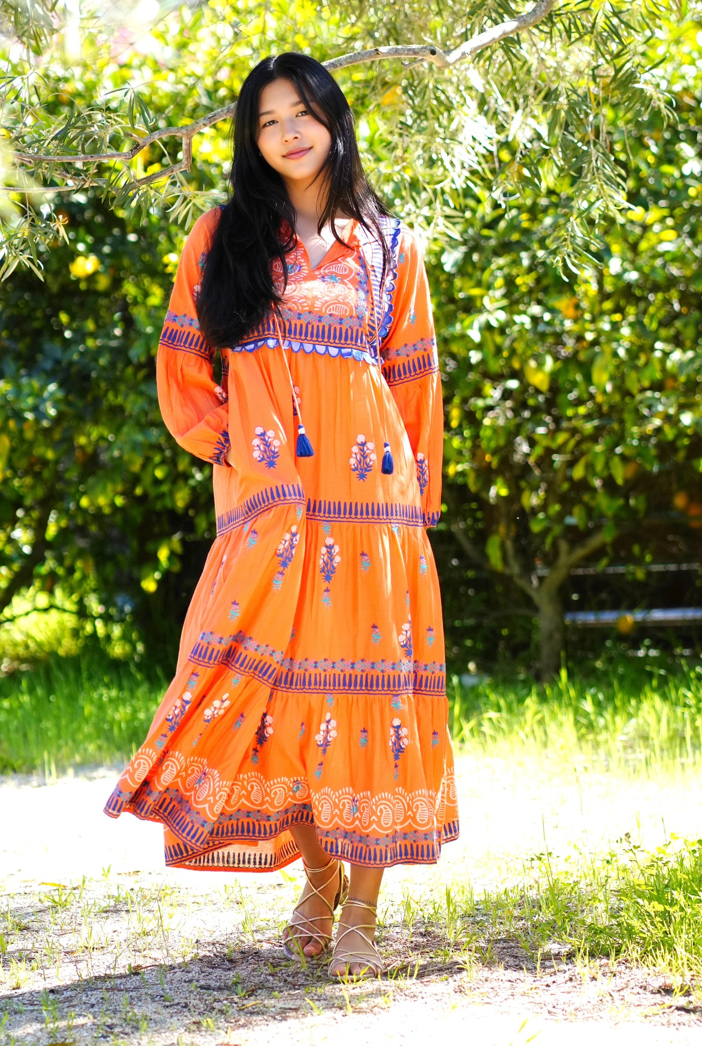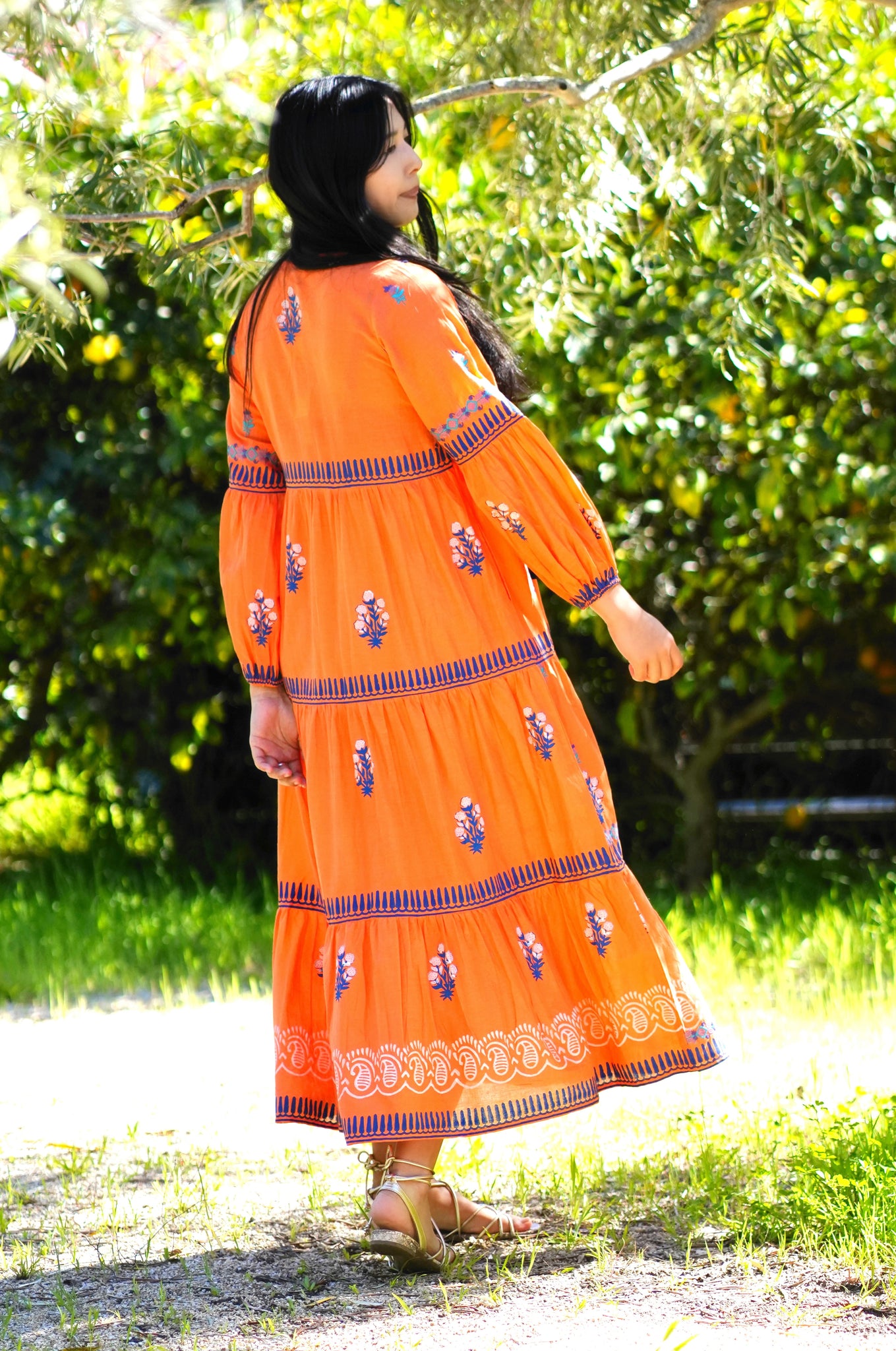 The Rita Hand Block Printed Dress is vacation ready with an easy silhouette and a floral hand block print with beautiful embroidered detailing. Perfect to throw over and go, this soft dress is a maxi length dress and has a side pocket.