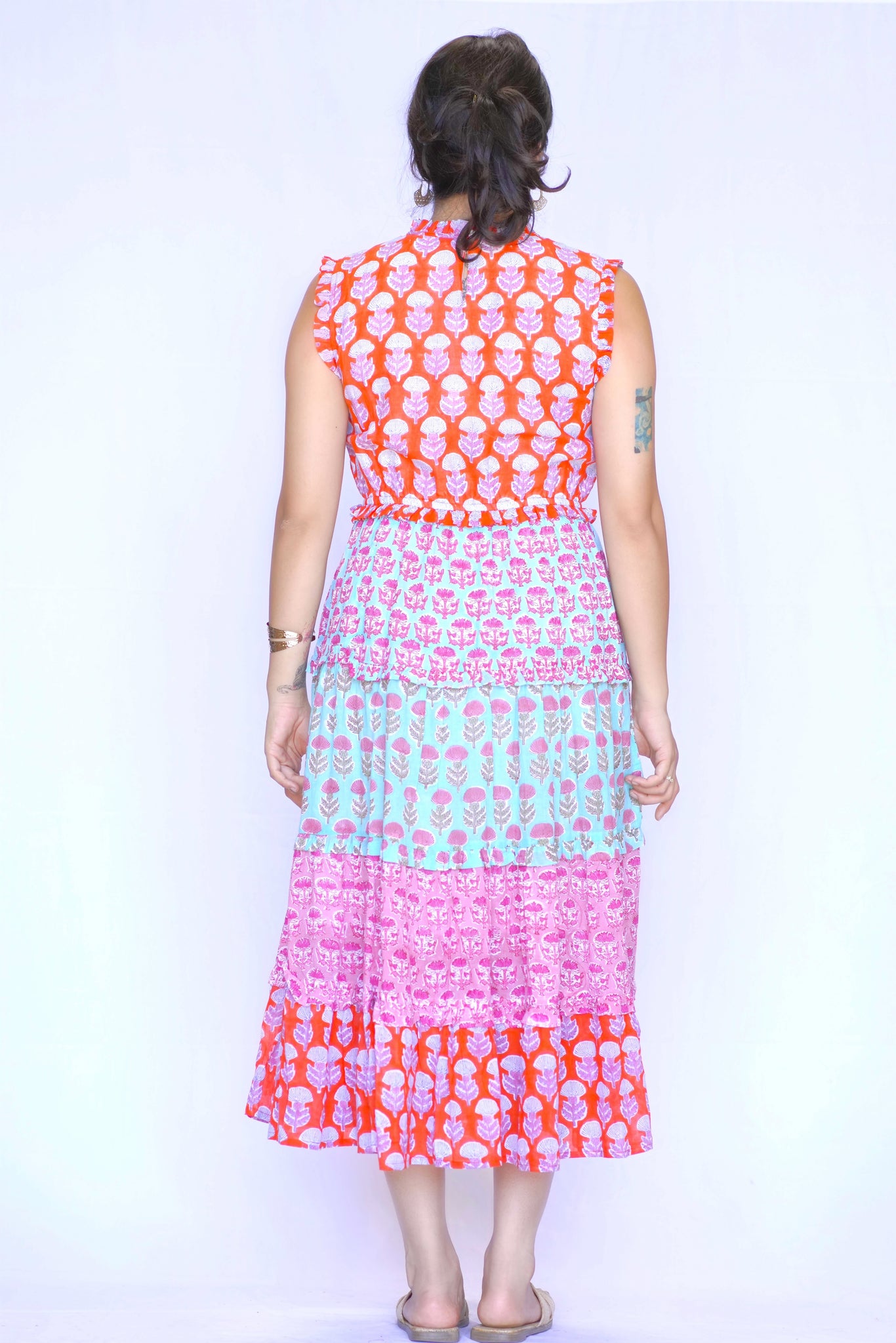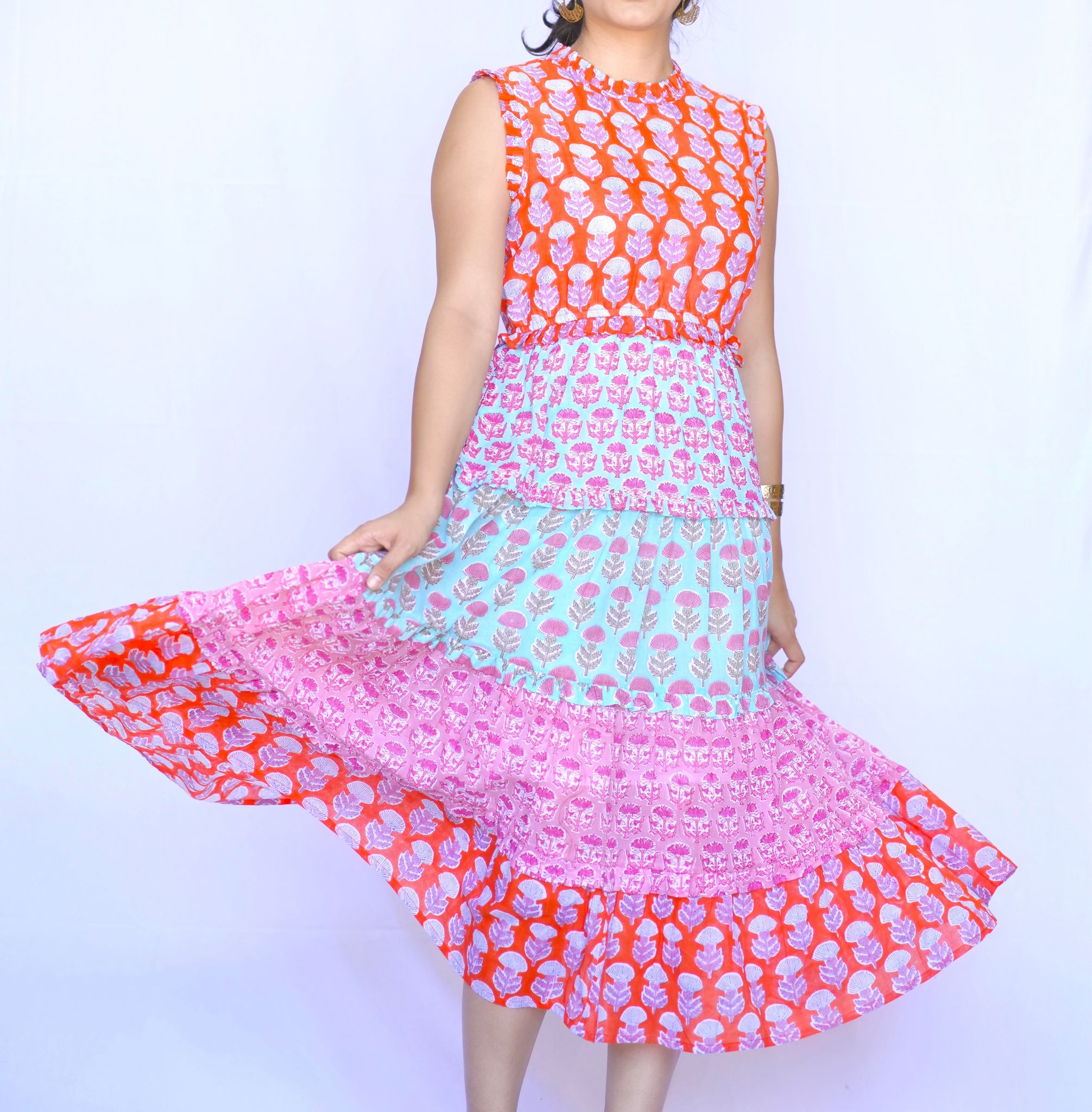 Turn heads in this vibrant tiered dress, crafted from 100% cotton for all-day comfort. Featuring bold floral block prints in playful color blocks and a flattering sleeveless cut, it’s your go-to for effortless style with a fun twist.