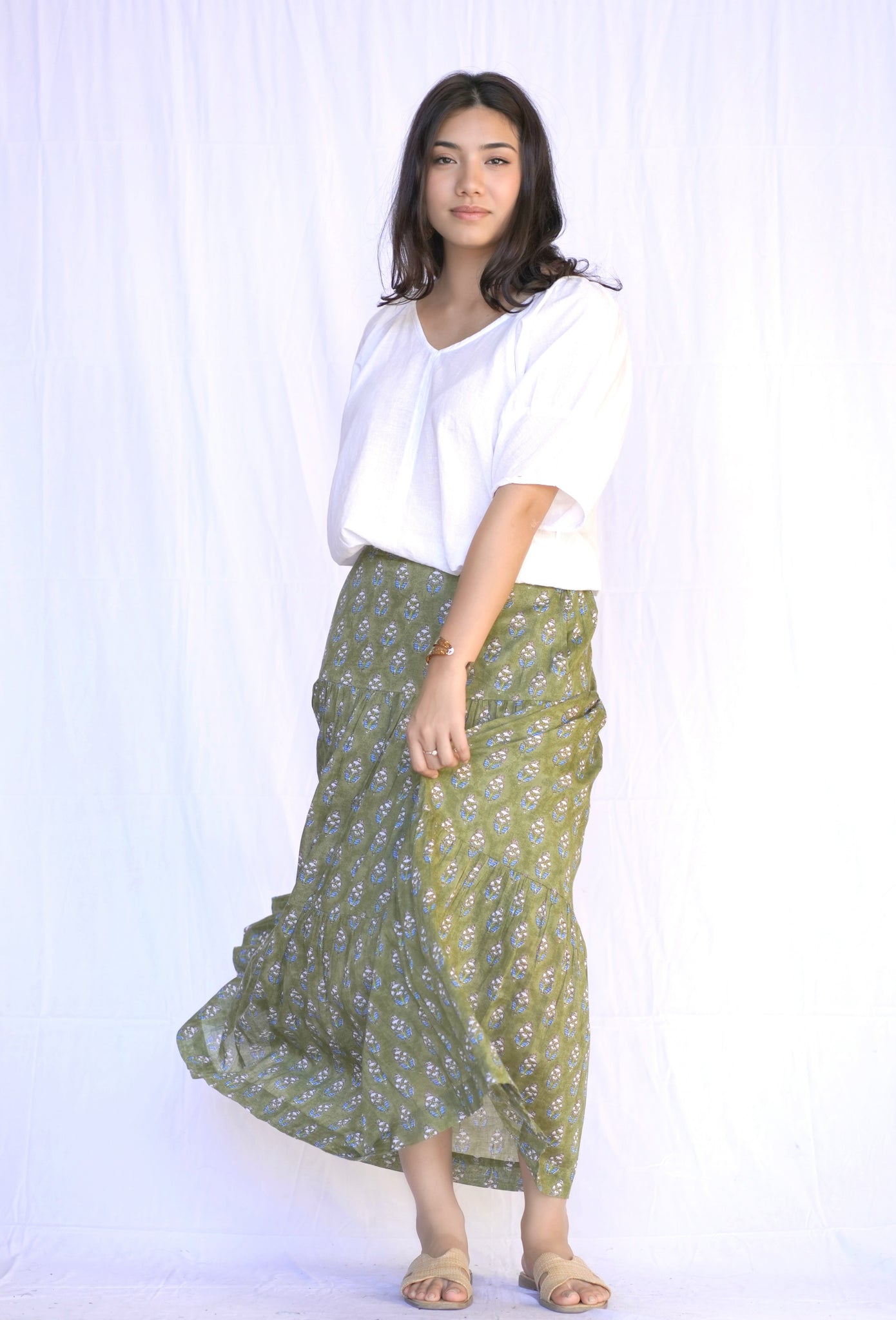 Tiered Cotton Skirt-Olive Multi