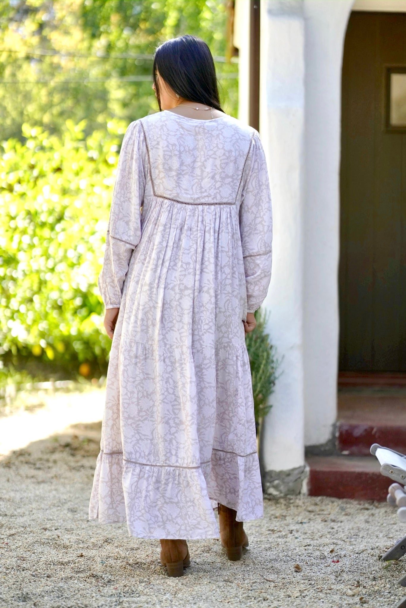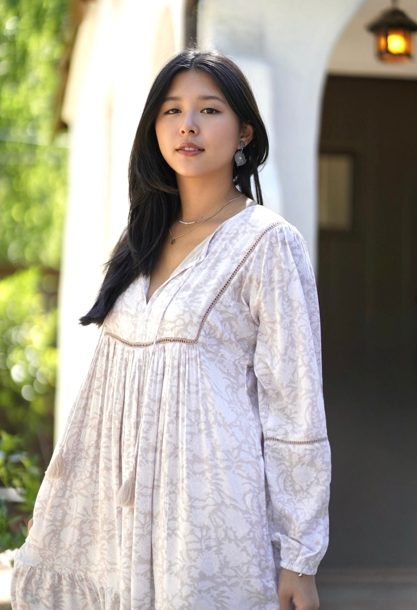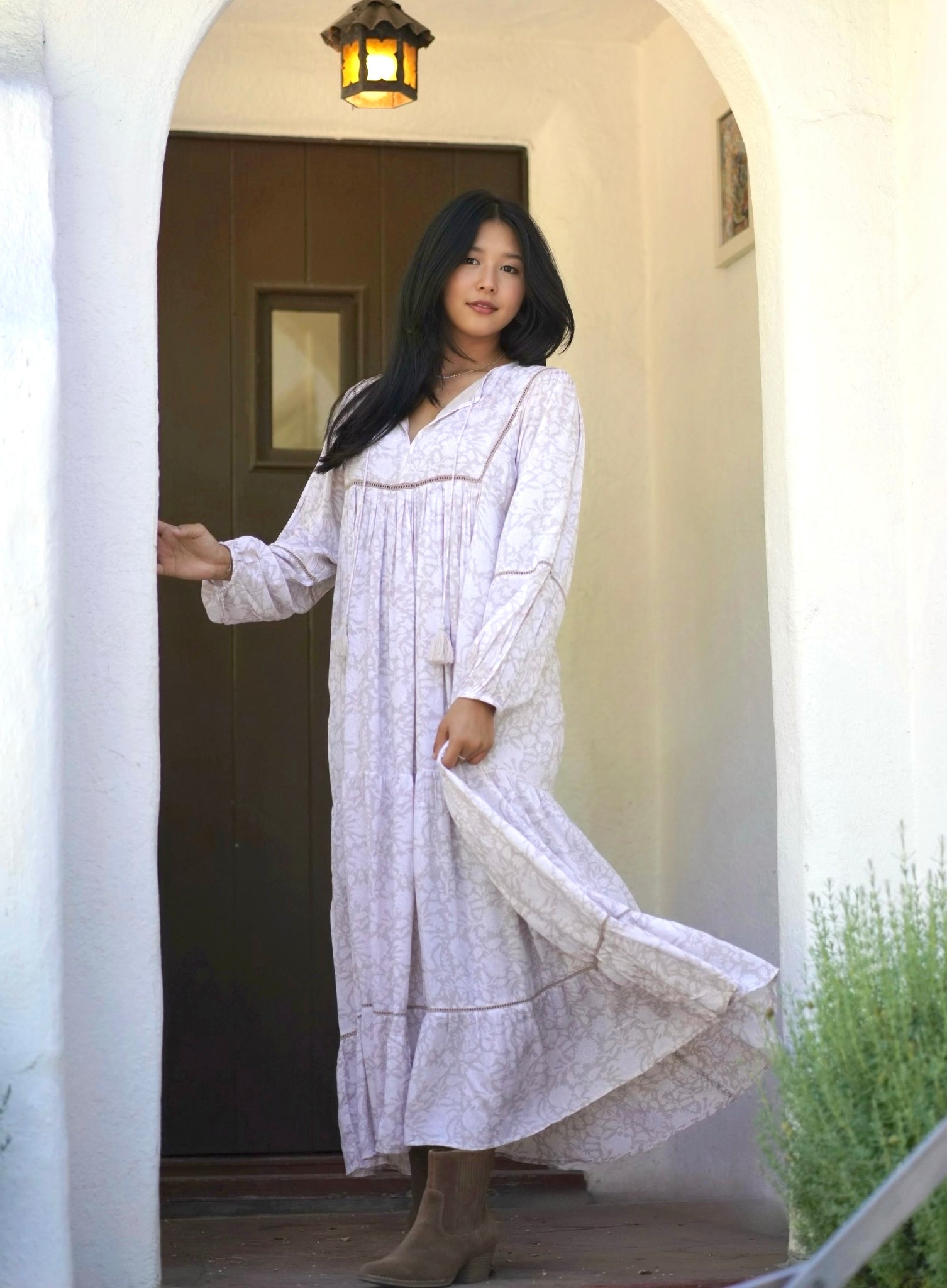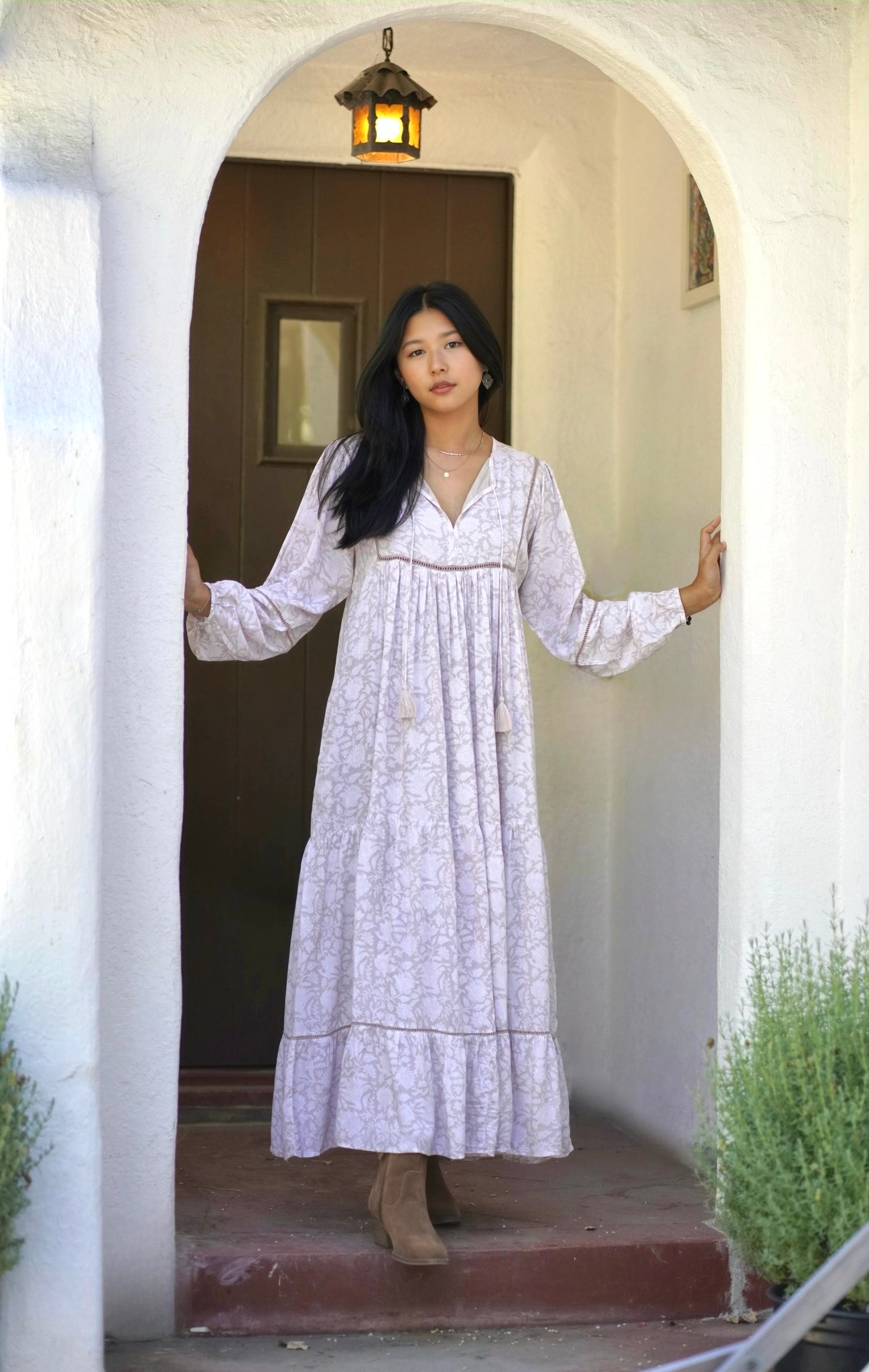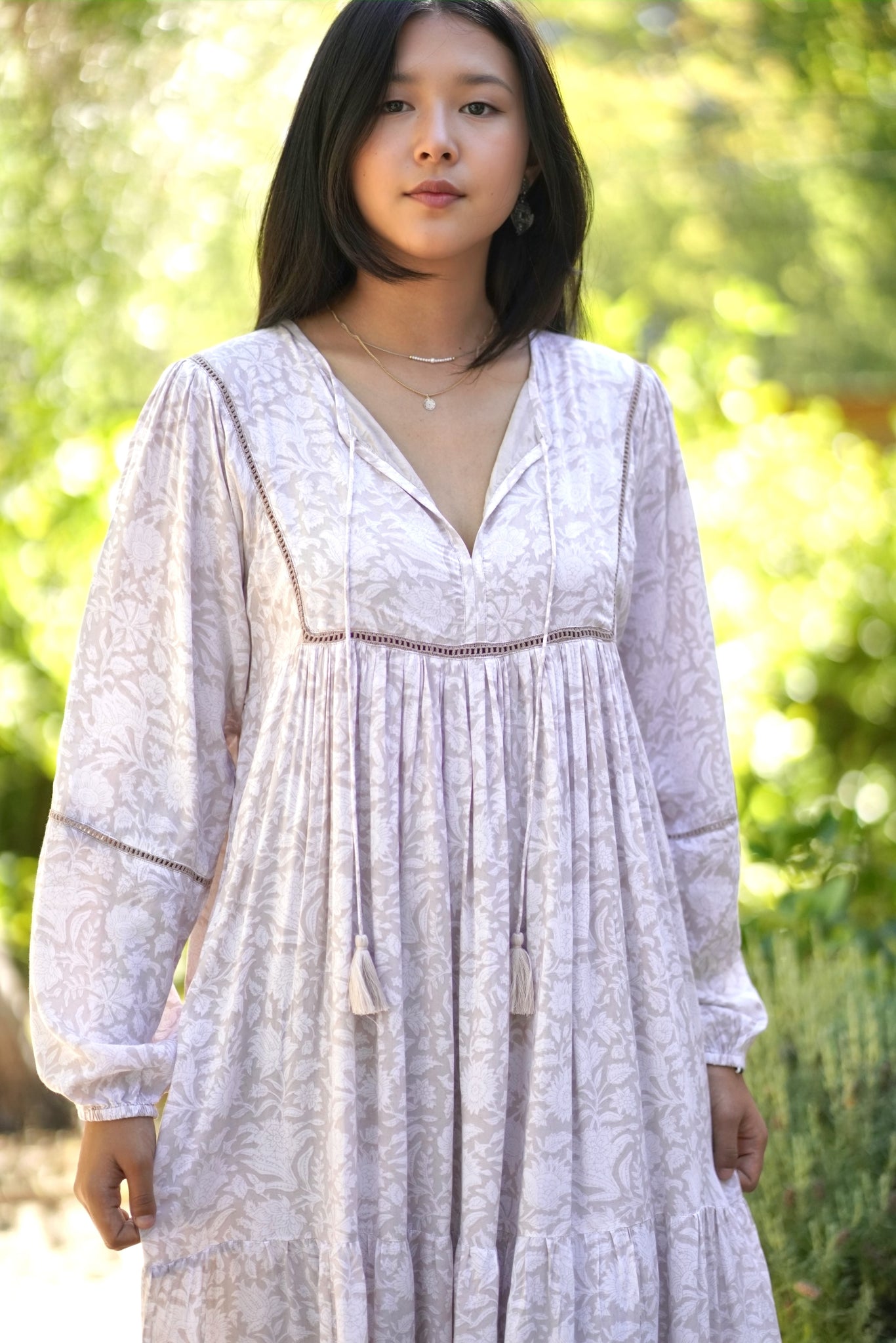 Ethically hand block printed by artisans in India, the Vida Maxi Dress is crafted from an extra soft modal fabric. This dress is designed with a feminine silhouette, tassel tie detail, and billowy sleeves.