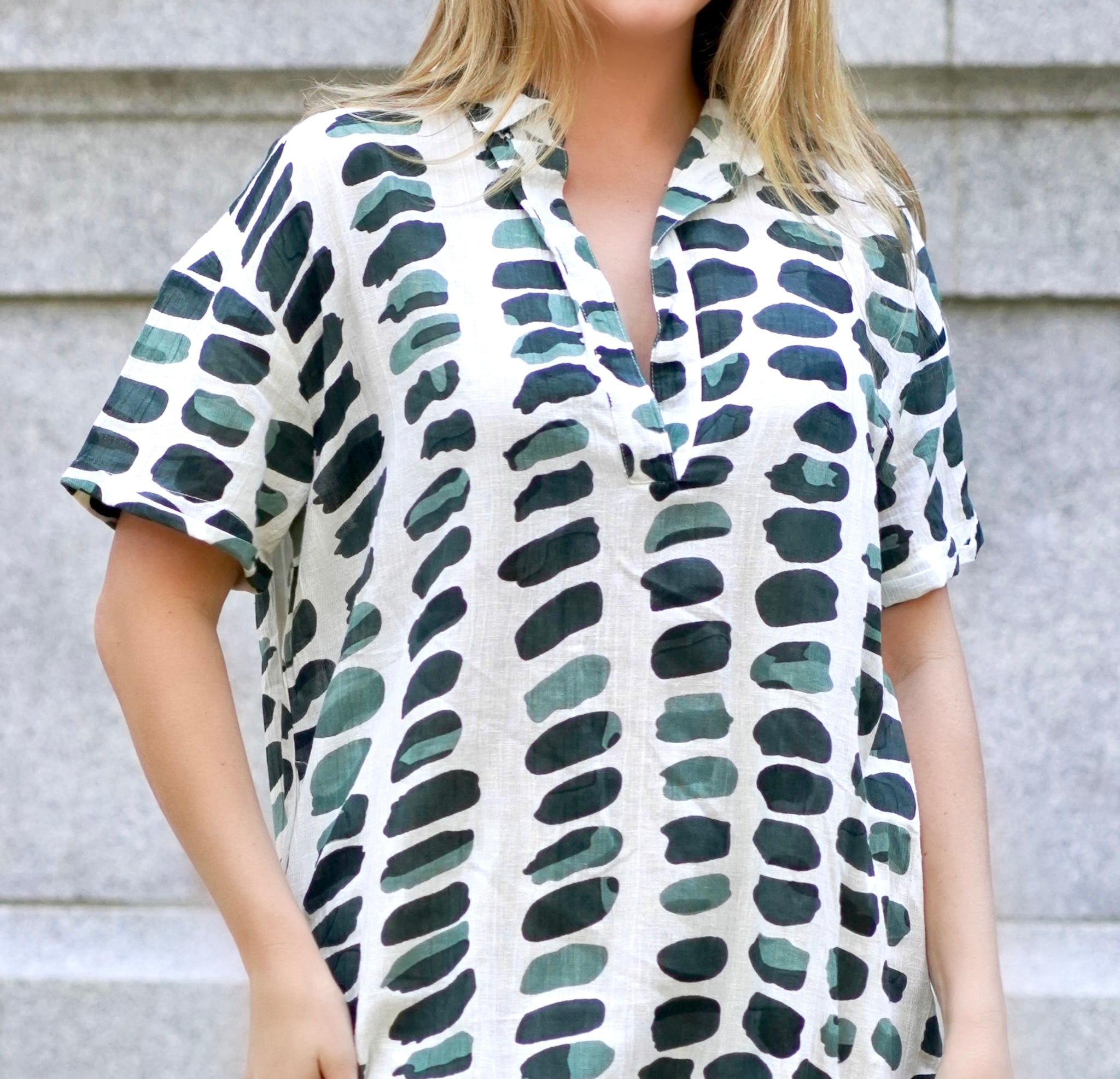 The Zoey Dress is a versatile dress in a fun geometric print that can be worn as a dress or as a cover up by the beach/pool.