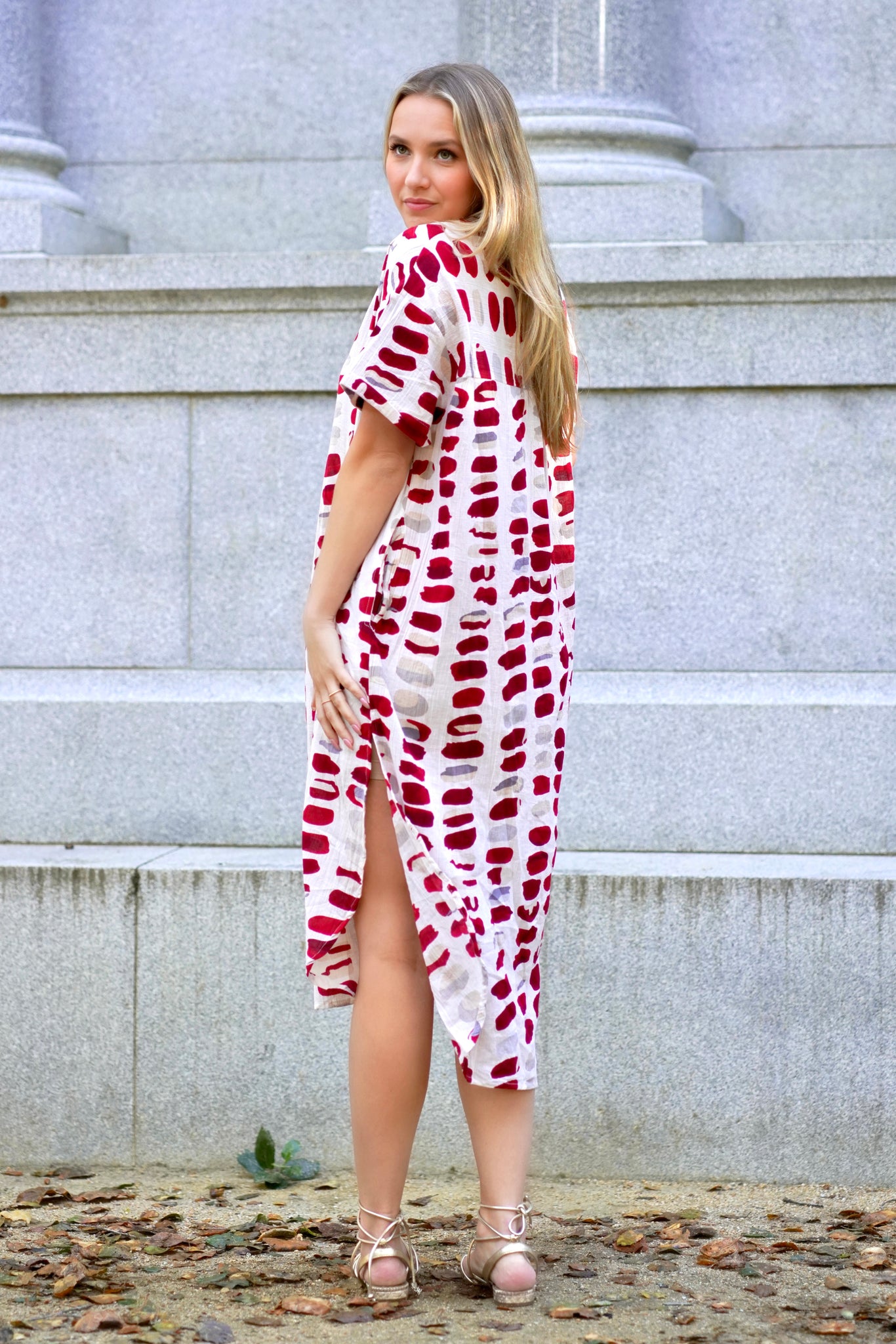 The lightweight airy cotton dress feature short length sleeves with pockets and a flattering collared v-neck and side slits.