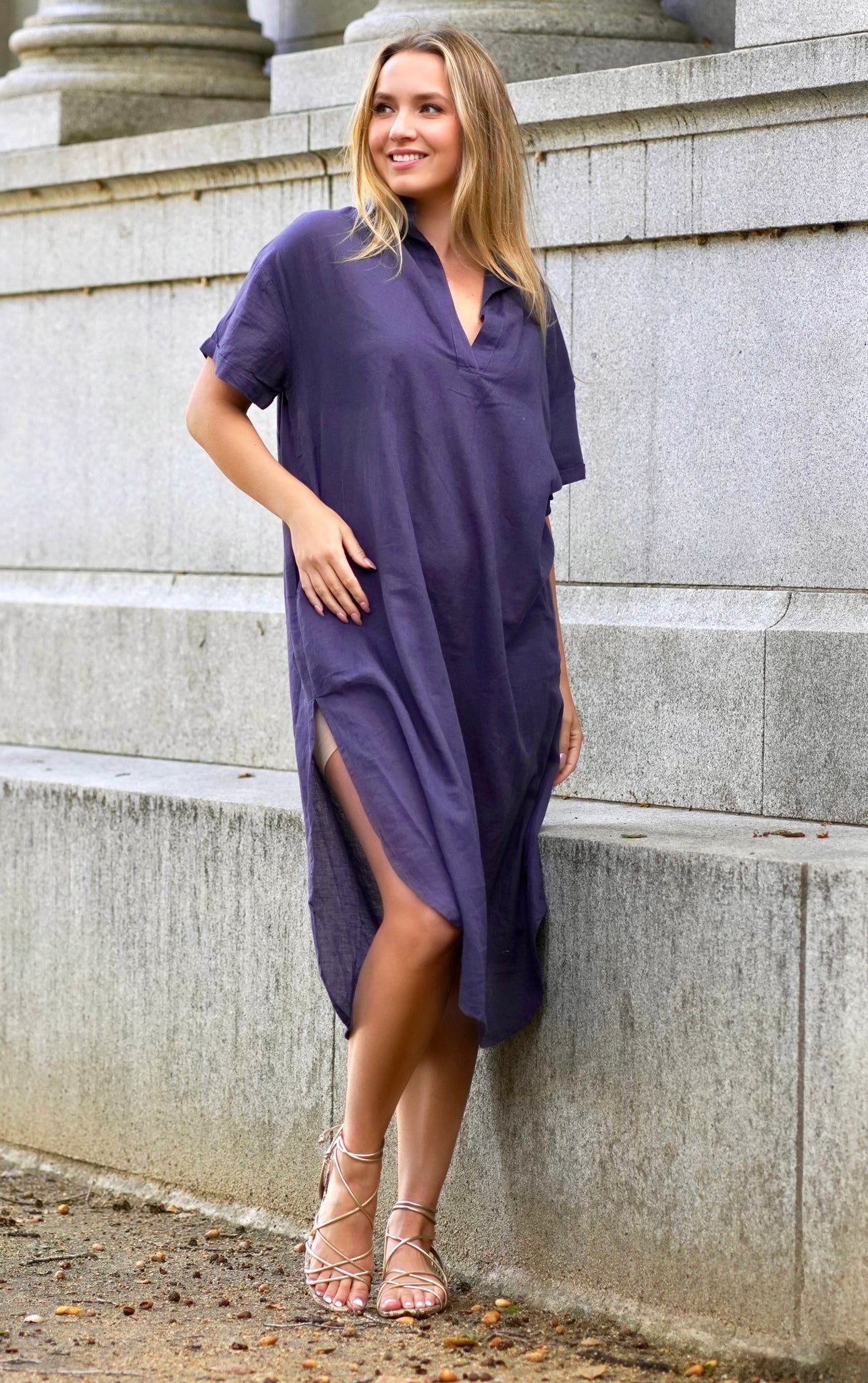 The lightweight airy cotton dress feature short length sleeves with pockets and a flattering collared v-neck and side slits.